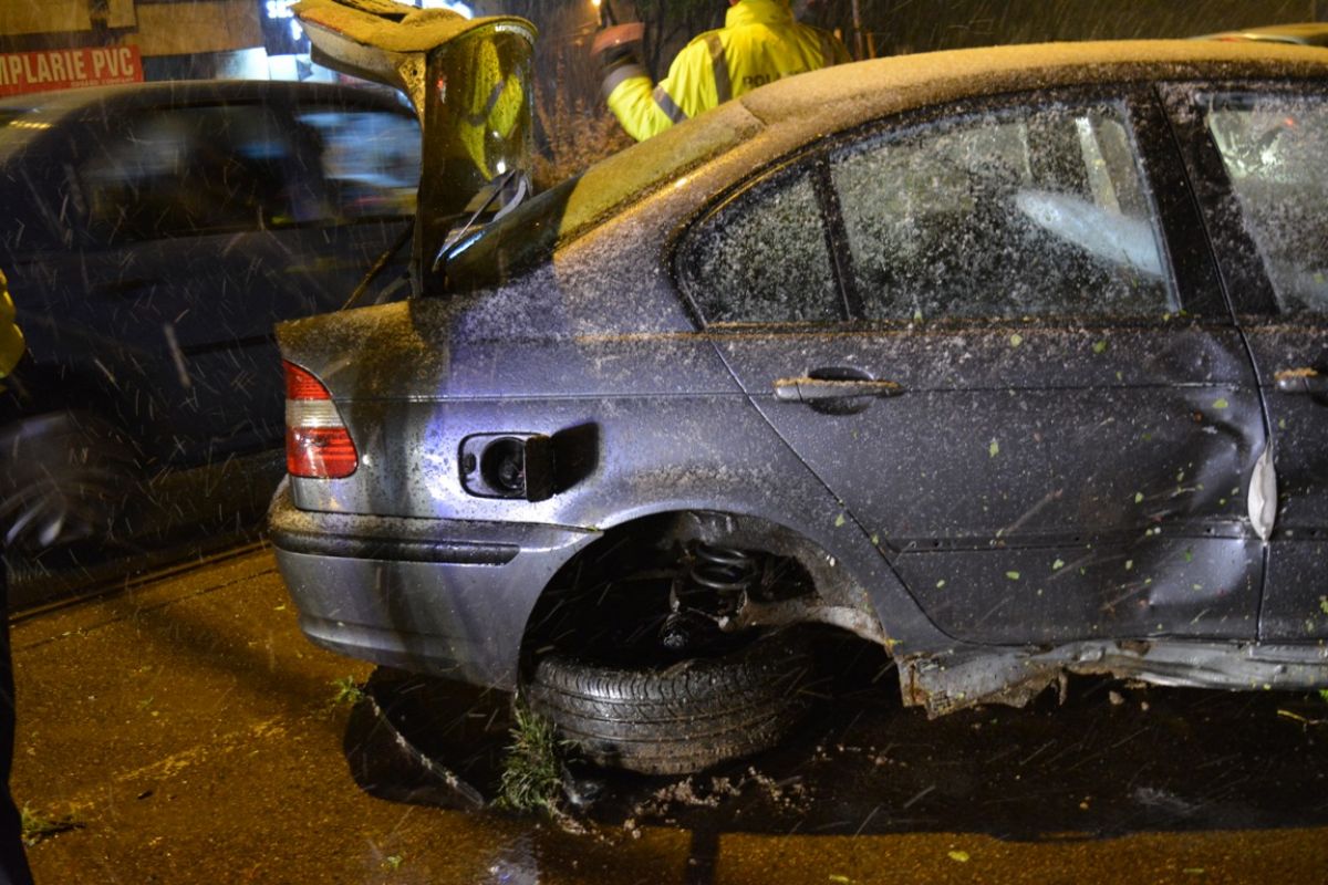 Automobilului i-a sărit roata dreapta spate, în cursa sa nebună colectând și ramuri de copaci.