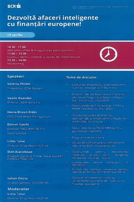 BCR în colaborare cu Camera de Comerț, Industrie și Agricultură Botoșani vă invită să participați la conferința Dezvoltă afaceri inteligente cu finanțări europene, ediția a II-a, care va avea loc joi, 18 aprilie 2024, începând cu ora 10:30, la Salon Luceafărul, Popas Cucorani.