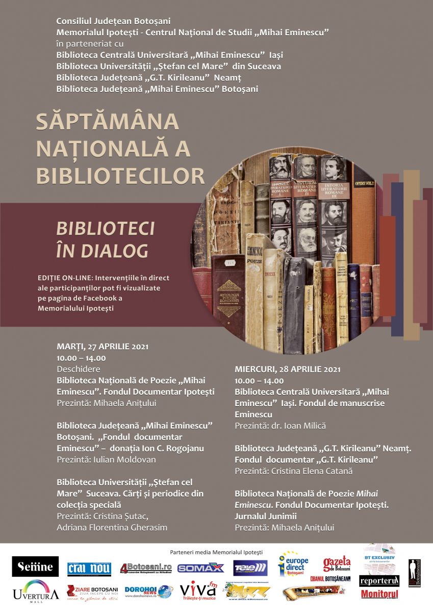 Biblioteca Națională de Poezie „Mihai Eminescu” a Memorialului Ipotești, organizează, pe 27 și 28 aprilie, cu ocazia Săptămânii Bibliotecilor, un dialog între biblioteci.