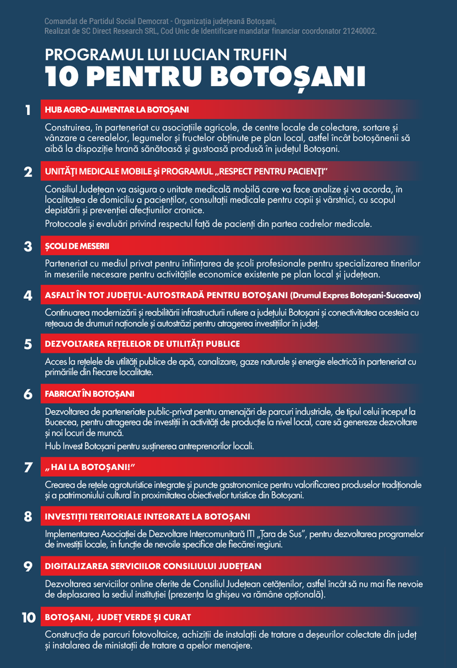 Comandat de Partidul Social Democrat - Organizația Județeană Botoșani, Realizat de SC Direct Research SRL, Cod Unic de Identificare mandatar financiar coordonator 21240002.