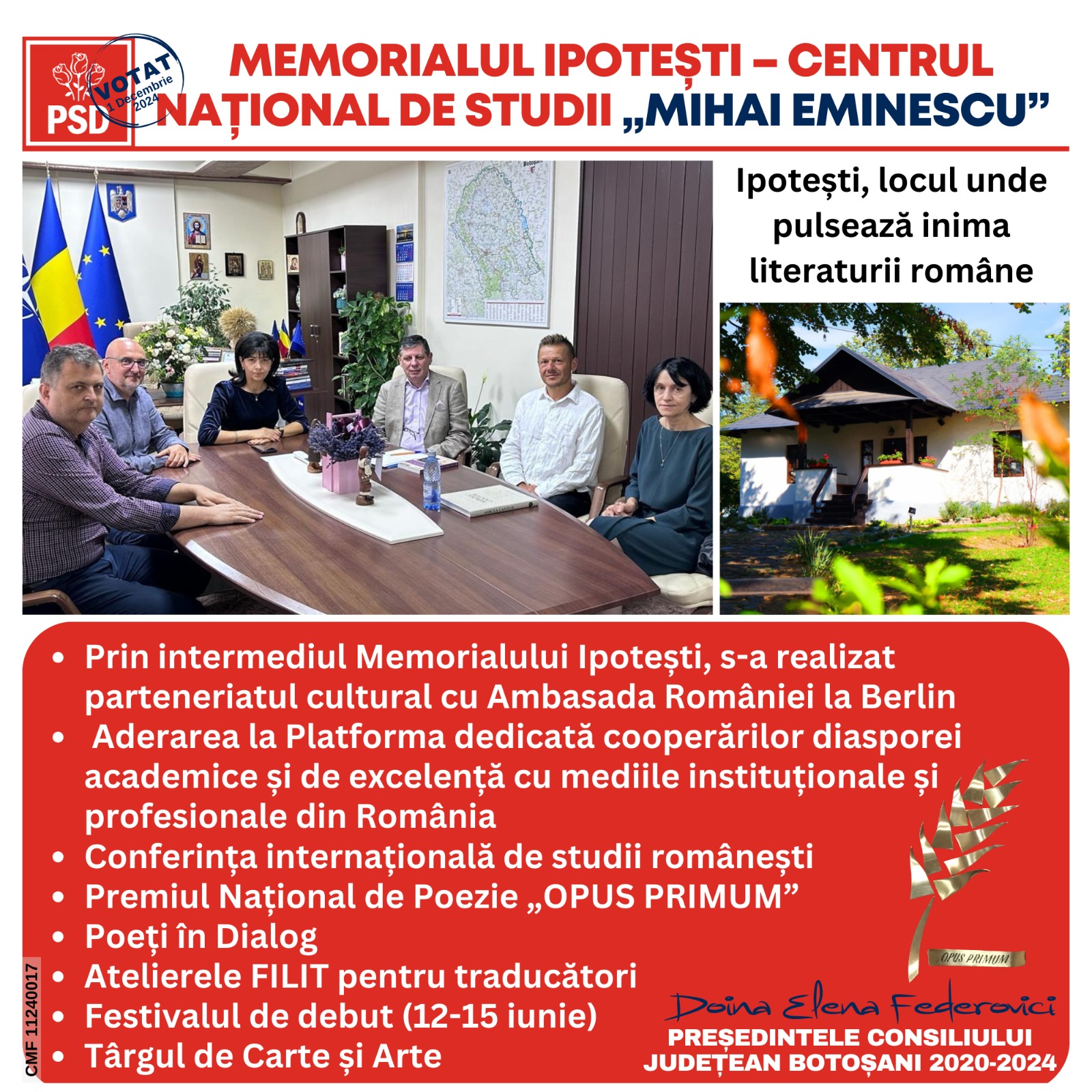 Prin Memorialul Ipotești, s-a realizat parteneriatul cultural cu Ambasada României la Berlin și cel cu Ministerul Afacerilor Externe pentru promovarea operei lui Mihai Eminescu și sărbătorirea în comun a Zilei Culturii Naționale, pe 15 ianuarie, zi în care s-a născut marele poet.