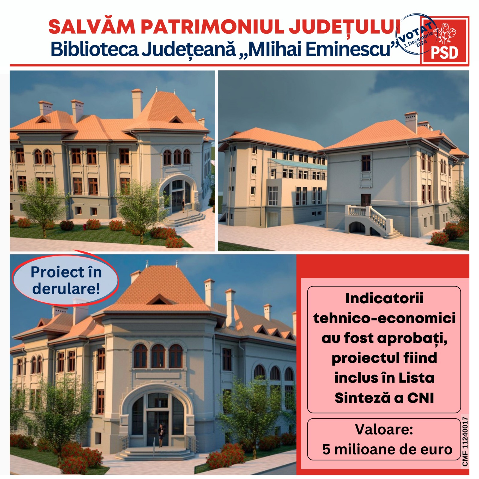 • Reabilitarea și restaurarea Bibliotecii Județene „Mihai Eminescu” - proiect inclus pe lista sinteză a CNI;