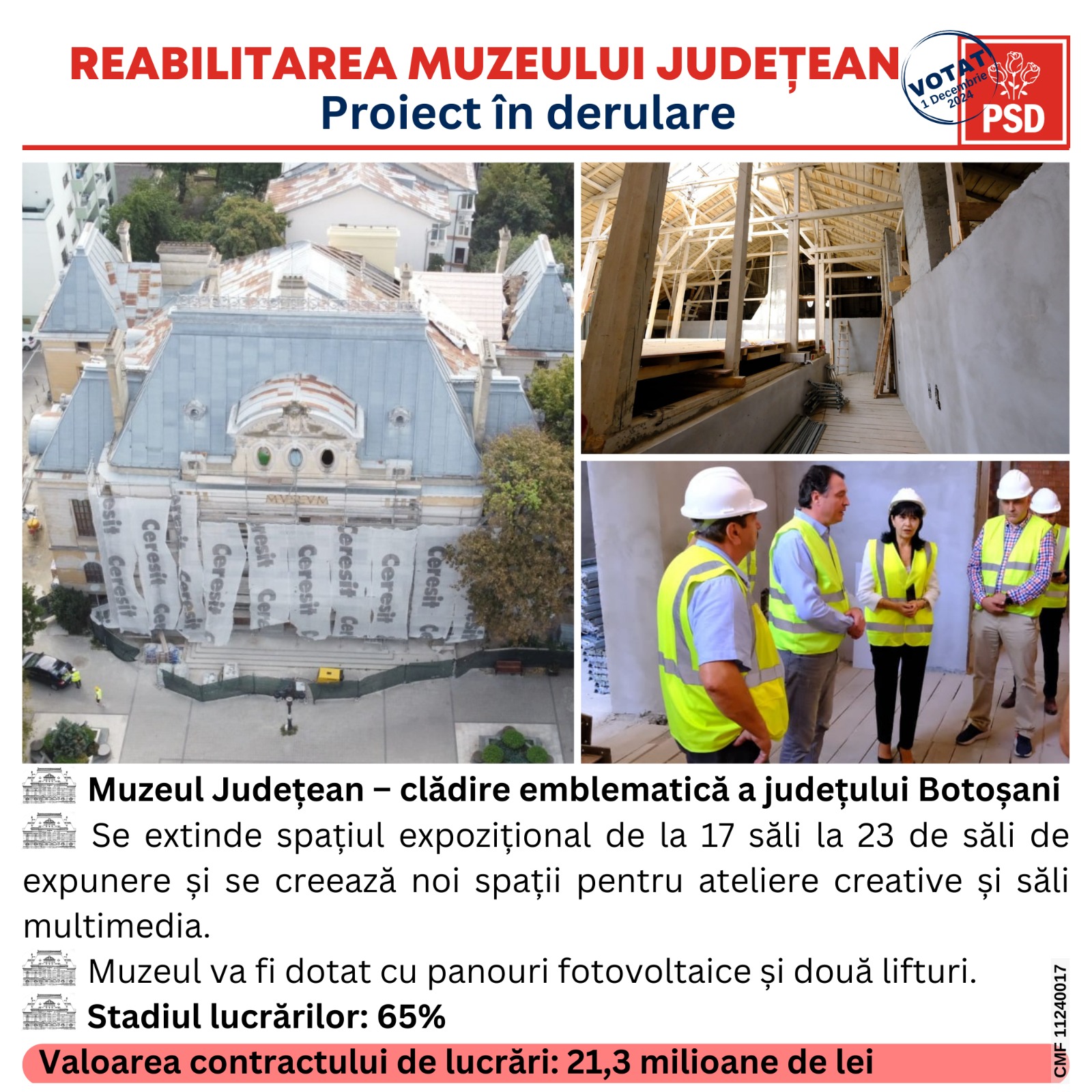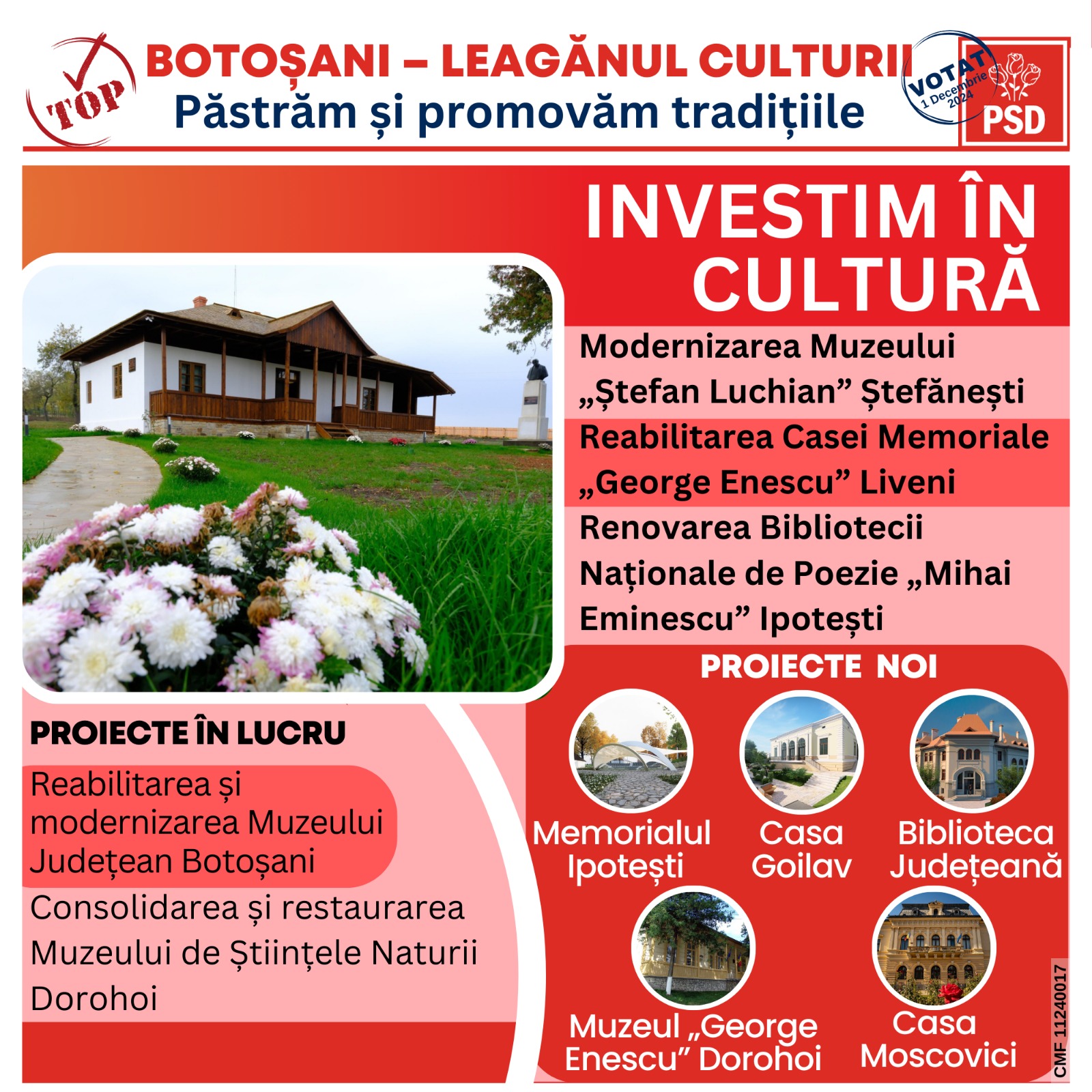 Încă din prima zi de mandat, am anunțat că, împreună cu echipa mea, punem un accent deosebit pe cultură, care este un adevărat brand pentru județul nostru. Investițiile în sectorul cultural au un impact semnificativ asupra întregii comunități, nu doar prin conservarea și promovarea tradițiilor, dar și prin stimularea educației, dezvoltarea turismului și crearea unor noi oportunități economice”, a declarat Doina Federovici, președintele PSD Botoșani.