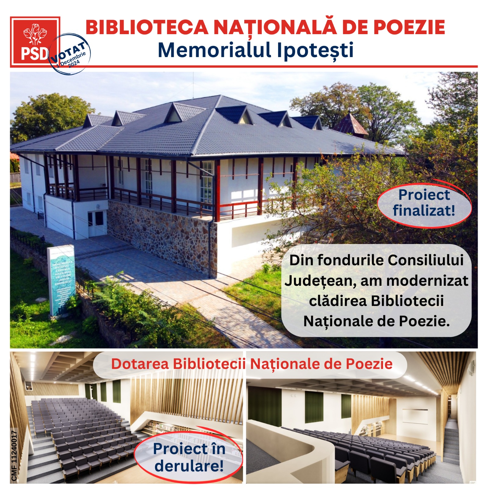 •  Modernizarea și reabilitarea Bibliotecii Naționale de Poezie „Mihai Eminescu” de la Ipotești;