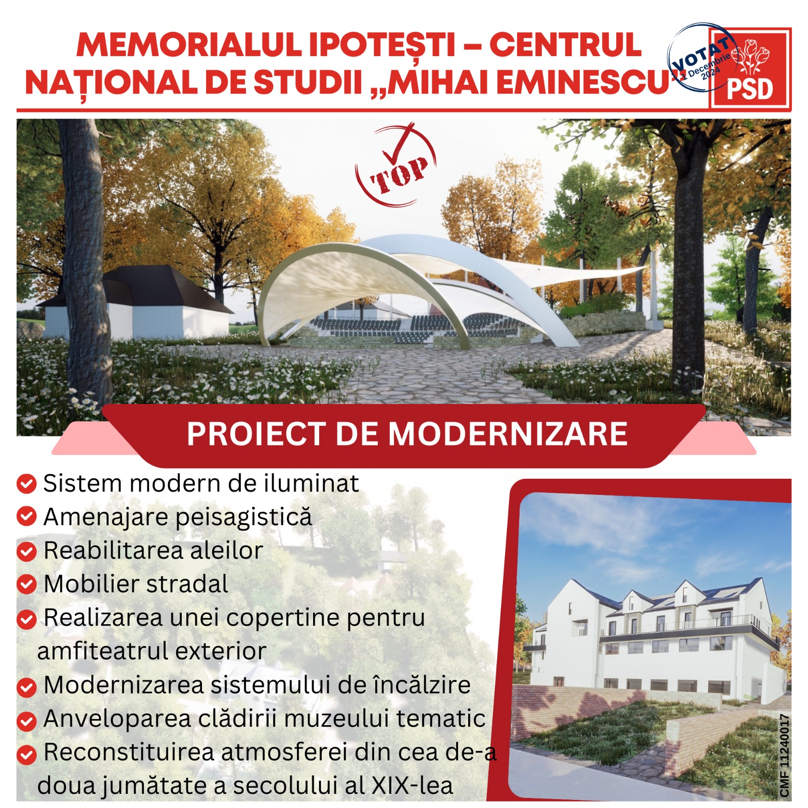 • Modernizarea Centrului Național de Studii - Memorialul Ipotești – unul dintre cele două proiecte din Regiunea de Nord-Est care îndeplinește principiile New European Bauhaus (NEB) și declarat a fi eligibil pentru finanțare;