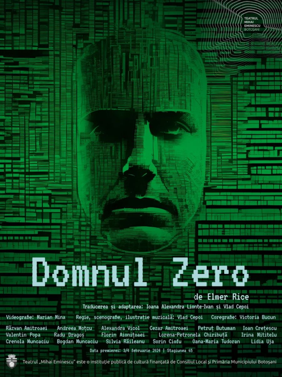 Sâmbătă, 3 februarie și duminică, 4 februarie de la ora 1800, Teatrul „Mihai Eminescu” vă invită la Casa Tineretului, B-dul Mihai Eminescu nr.48 la premiera spectacolului „Domnul Zero” de Elmer Rice, regia Vlad Cepoi. Vlad Cepoi este și cel care a făcut traducerea și adaptarea textului, dar și scenografia și ilustrația muzicală a spectacolului. Coregrafia spectacolului este realizată de Victoria Bucun. Din distribuție fac parte: Răzvan Amitroaei, Andreea Moțcu, Alexandra Vicol, Cezar Amitroaei, Petruț Butuman, Florin Aionițoaei, Lorena-Petronela Chiribuță, Irina Mititelu, Radu Dragoș, Crenola Muncaciu, Bogdan Muncaciu, Silvia Răileanu, Sorin Ciofu, Oana-Maria Tudoran, Valentin Popa, Lidia Uja, Ioan Crețescu.