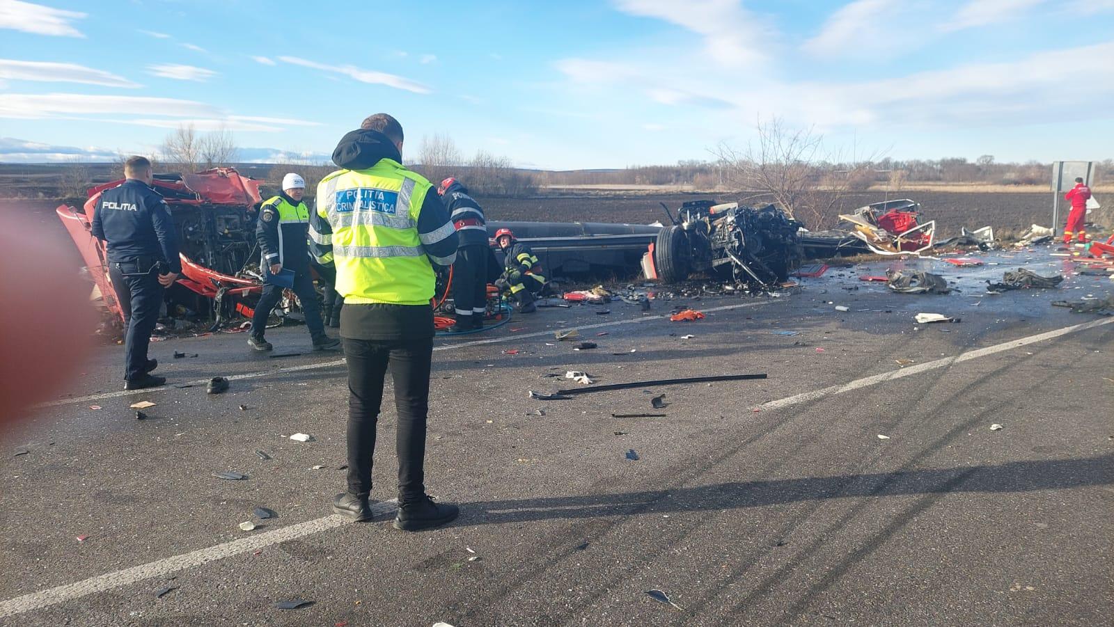 Primele imagini de la locul nenorocirii arată un adevărat dezastru. Motorul unuia dintre TIR-uri a zburat pe asfalt, în timp ce cabina a ajuns pe câmp și este complet distrusă.
