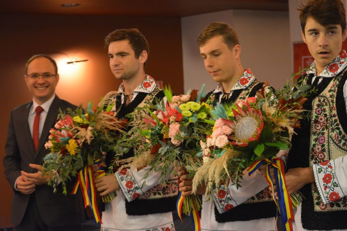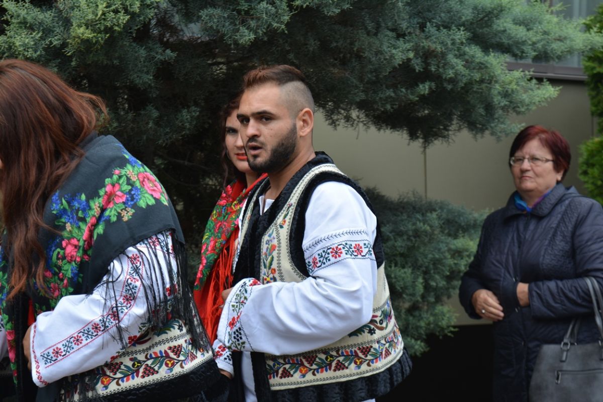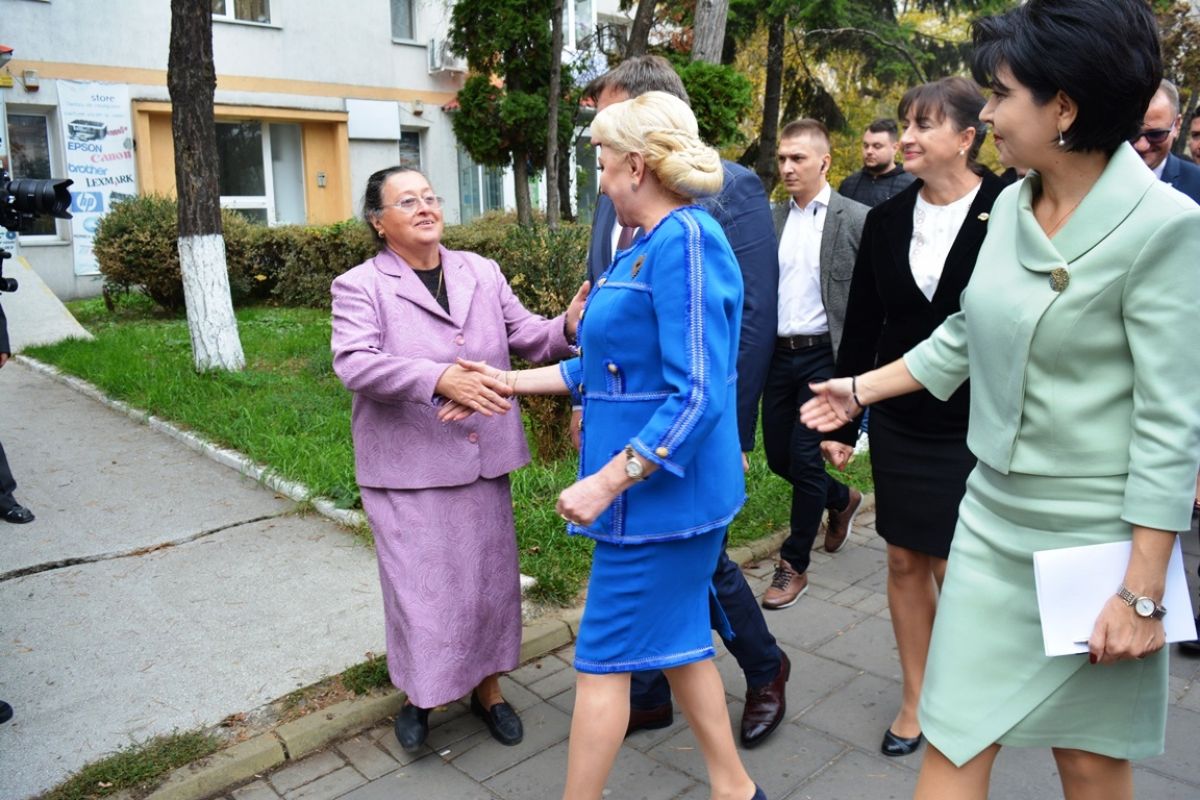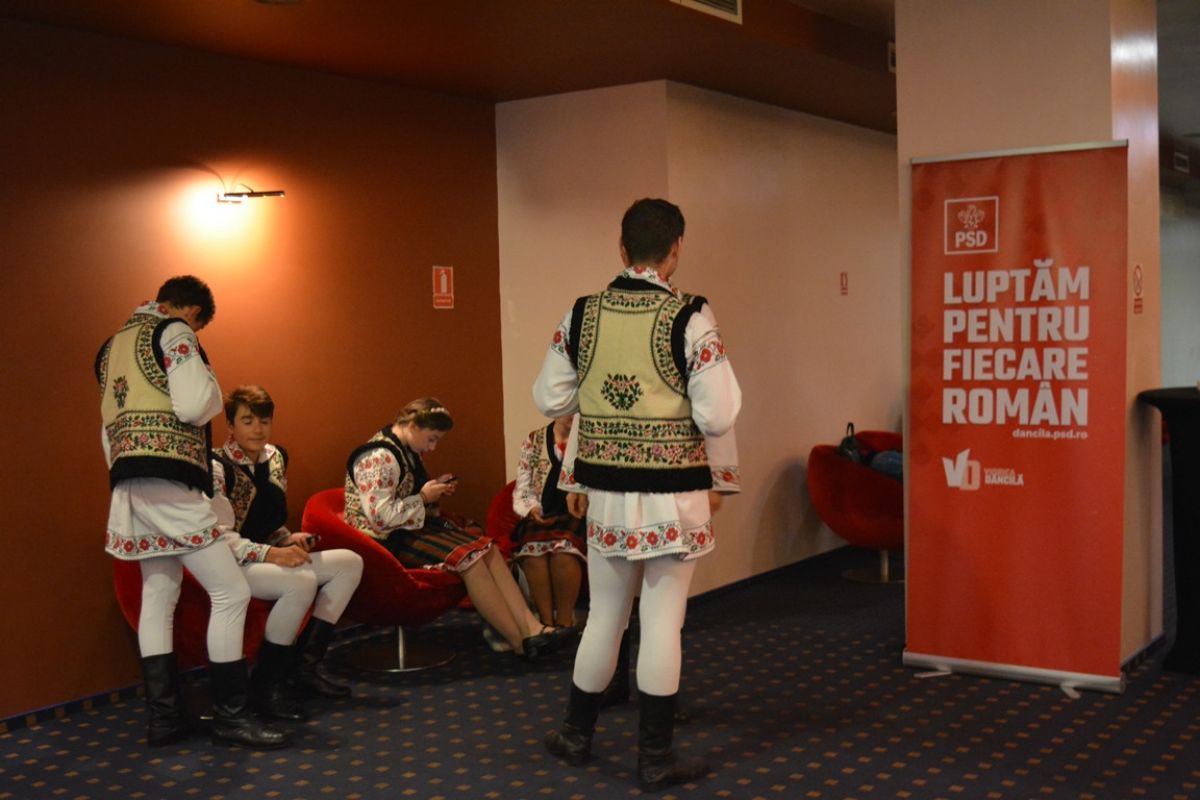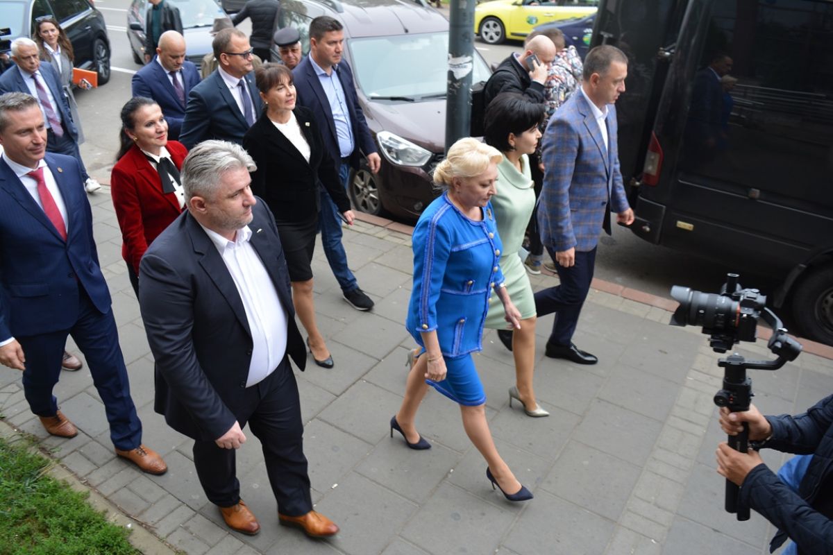 Viorica Dăncilă a fost primită de câțiva tineri în costume populare, care contrastau puternic cu fundalul muzical: Survivor - Eye Of The Tiger.