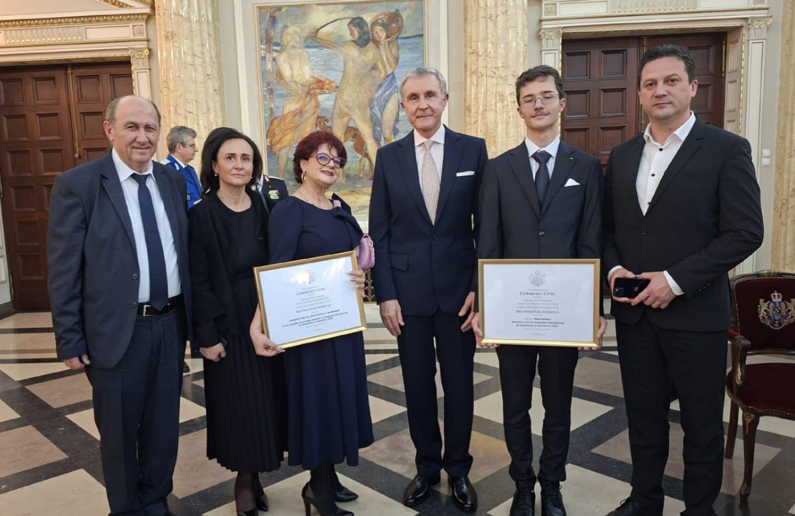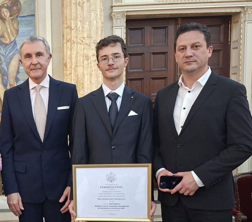 În acest cadru solemn, găzduit de Palatul Regal, m-am bucurat să fiu martorul unui moment care va rămâne, fără îndoială, memorabil pentru întreaga comunitate educațională botoșăneană: acordarea distincției ,,Curajul Civic" elevului Matei BUTNARU, de la Colegiul Național ,,Mihai Eminescu" Botoșani, medaliat cu AUR la Olimpiada Internațională de Astronomie și Astrofizică pentru Juniori (IOAA Jr) 2025, o performanță de excepție care îl clasează printre cele mai promițătoare tinere talente ale învățământului românesc.