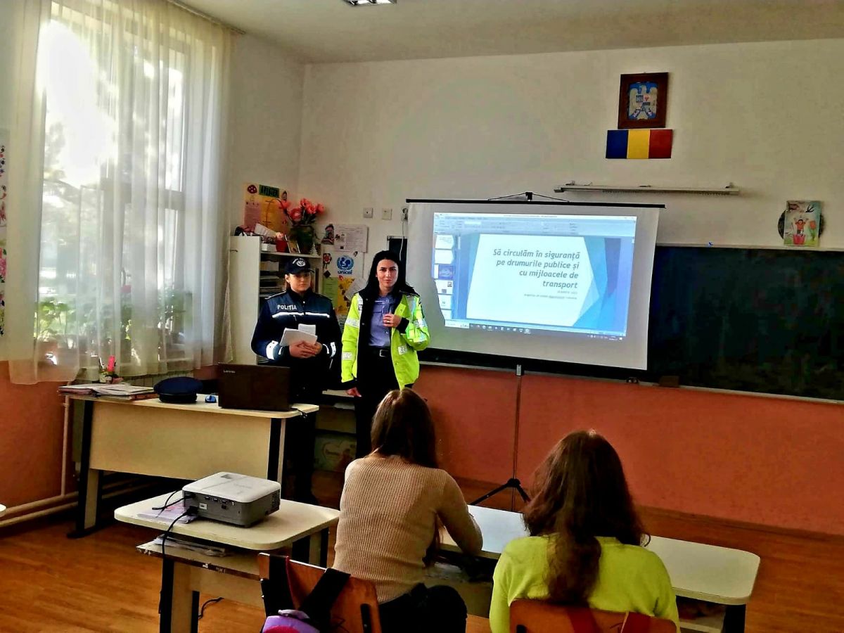 Polițiștii le-au vorbit elevilor despre importanța respectării regulilor de siguranță în momentul în care se află proximitatea căilor ferate sau când călătoresc și le-au prezentat un material educativ ”Poliția Transporturi-călătorie în siguranță”.