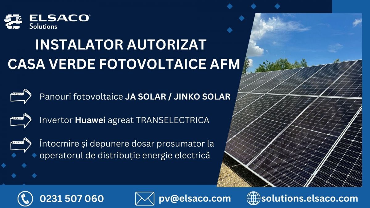 Elsaco Solutions este instalator autorizat, validat de Administrația Fondului pentru Mediu, în programul de finanțare Casa Verde Fotovoltaice privind instalarea sistemelor de panouri fotovoltaice pentru producerea de energie electrică, în vederea acoperirii necesarului de consum și livrării surplusului în rețeaua națională.