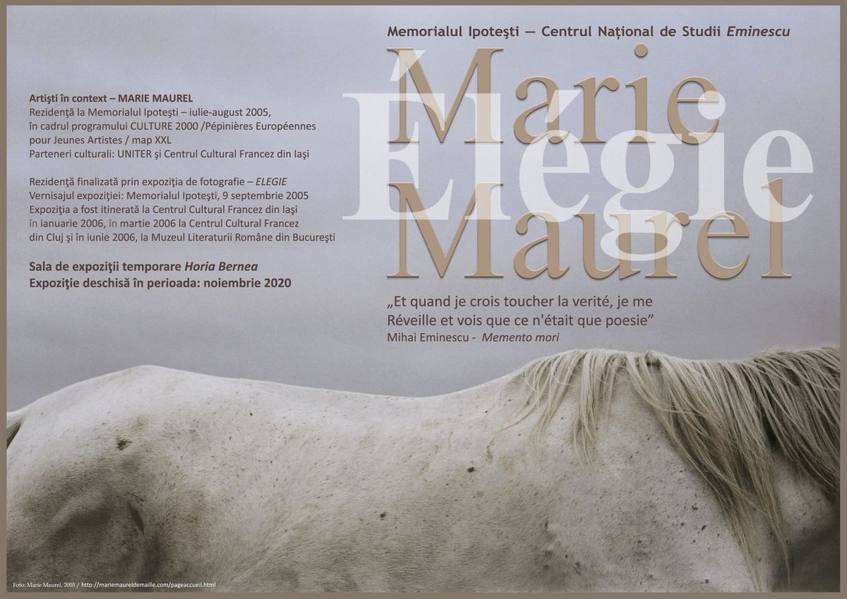 Născută la Lyon (Franţa), Marie Maurel a încercat, pe parcursul celor două luni de rezidenţă, să se apropie, prin intermediul fotografiei, de esenţa acestui spaţiu, căutând conexiunile care se pot face între imaginile unei realităţi existente şi imaginile generate de lecturile din opera sau despre viaţa lui Mihai Eminescu. Din selecţia de 27 de fotografii, Marie Maurel a creat o elegie-poem fotografic ce intră în rezonanţă cu memoria locului.