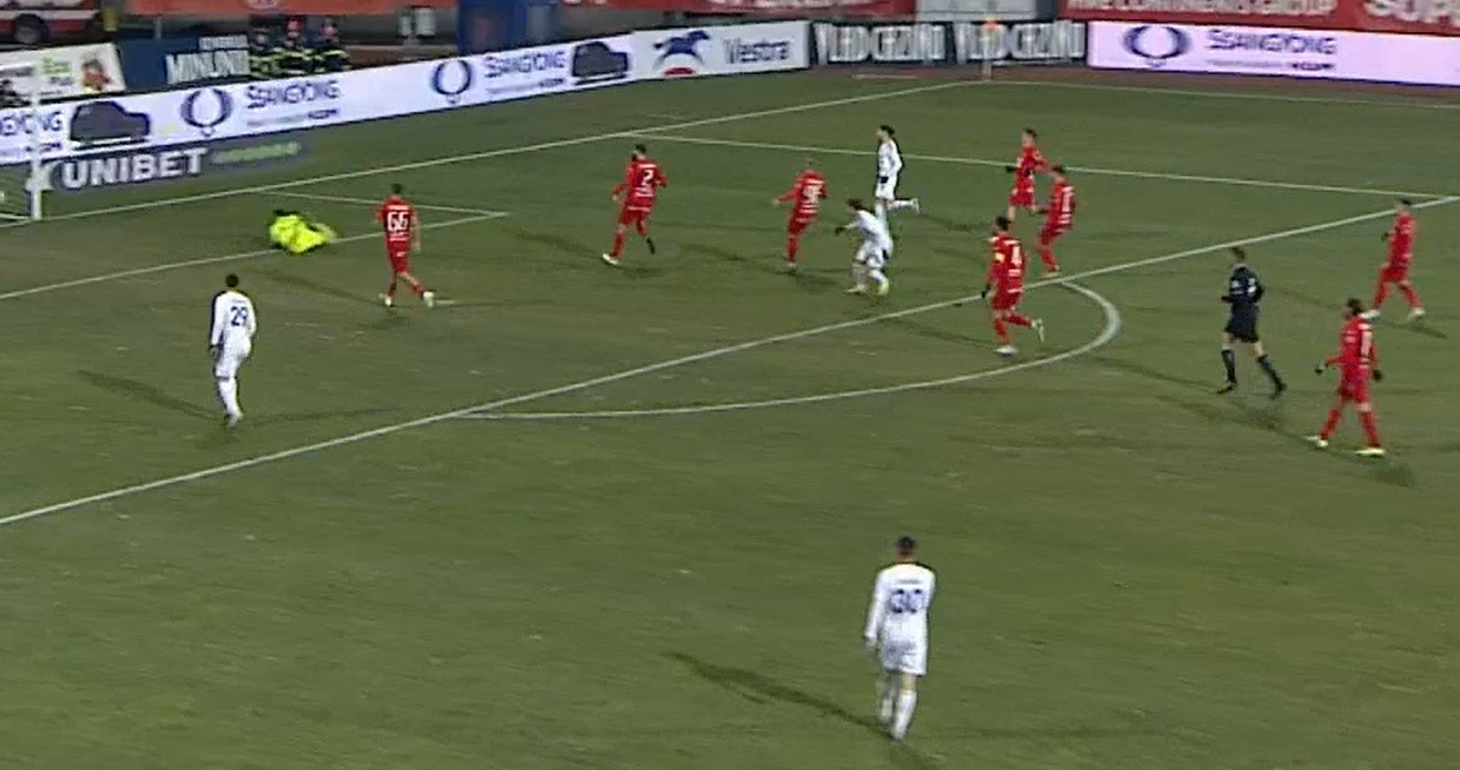 În minutul 74, sibienii dau lovitura prin Balaure. Imediat după, Liviu Ciobotariu a epuizat schimbările întrucât au intrat Mouaddib și Fulop în locul lui Petro și Sadiku.
