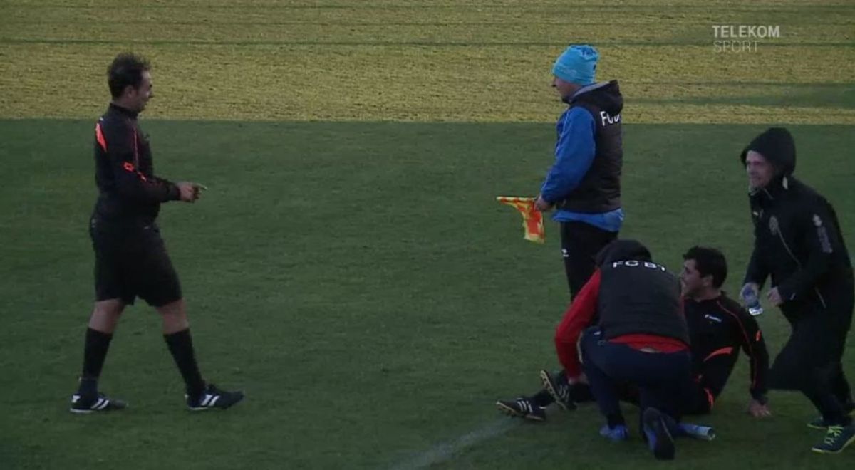 Meciul a fost întrerupt câteva minute, pentru că unul dintre tuşieri s-a accidentat, relatează telekomsport.ro. Medicul moldovenilor l-a ajutat să revină.