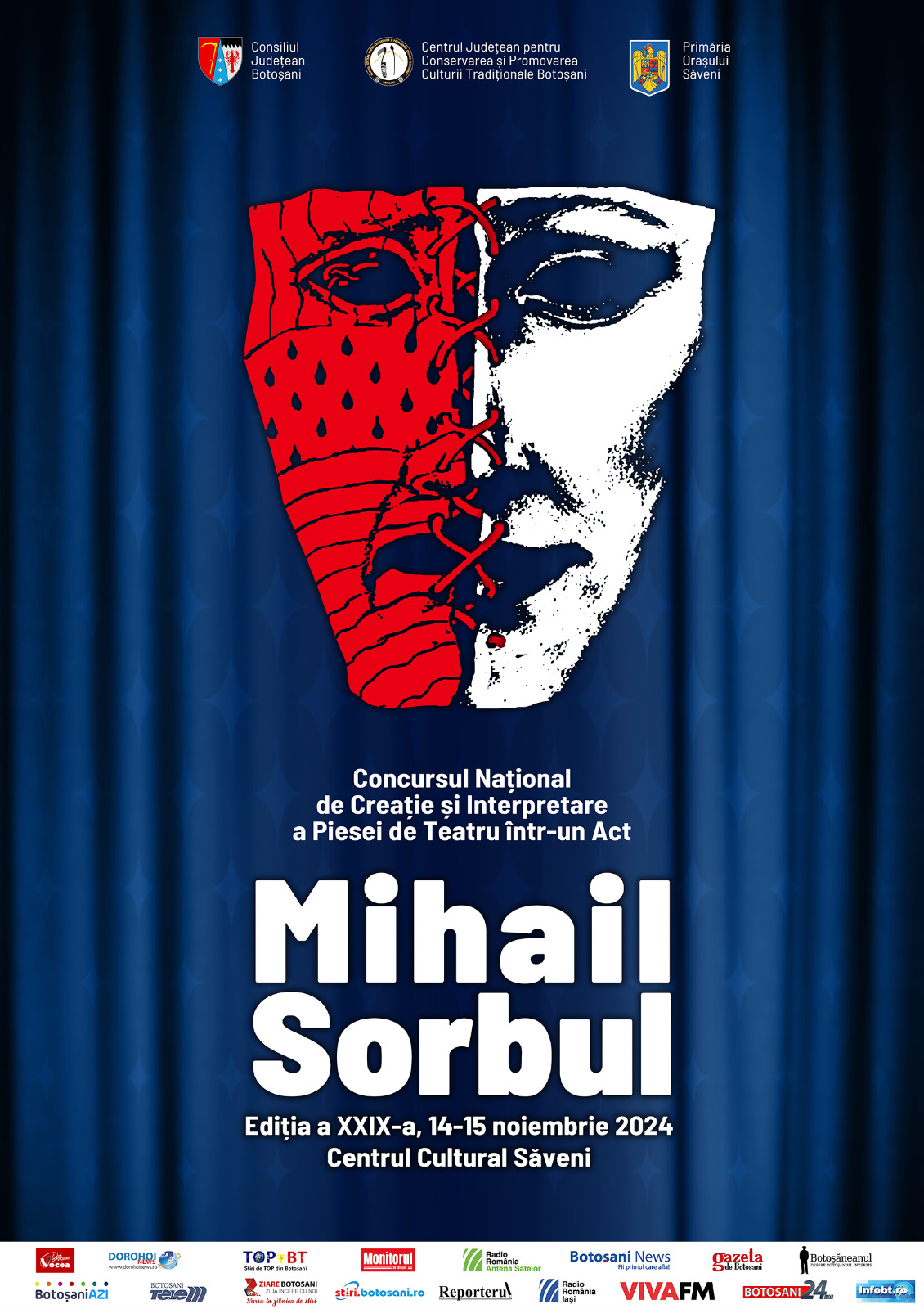 În perioada 14-15 noiembrie 2024, Centrul Județean pentru Conservarea și Promovarea Culturii Tradiționale Botoșani, cu sprijinul Consiliului Județean Botoșani, și în parteneriat cu Primăria Orașului Săveni, organizează cea de a XXIX-a ediţie a Festivalului-Concurs de Creație și Interpretare a Piesei de Teatru într-un Act „Mihail Sorbul”.
