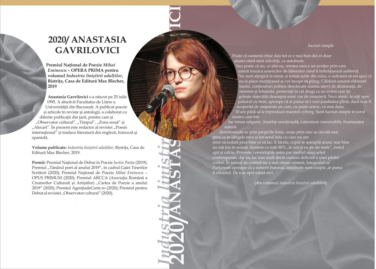 Anastasia Gavrilovici este laureată a Premiului Național de Poezie „Mihai Eminescu” – OPUS PRIMUM (2020).