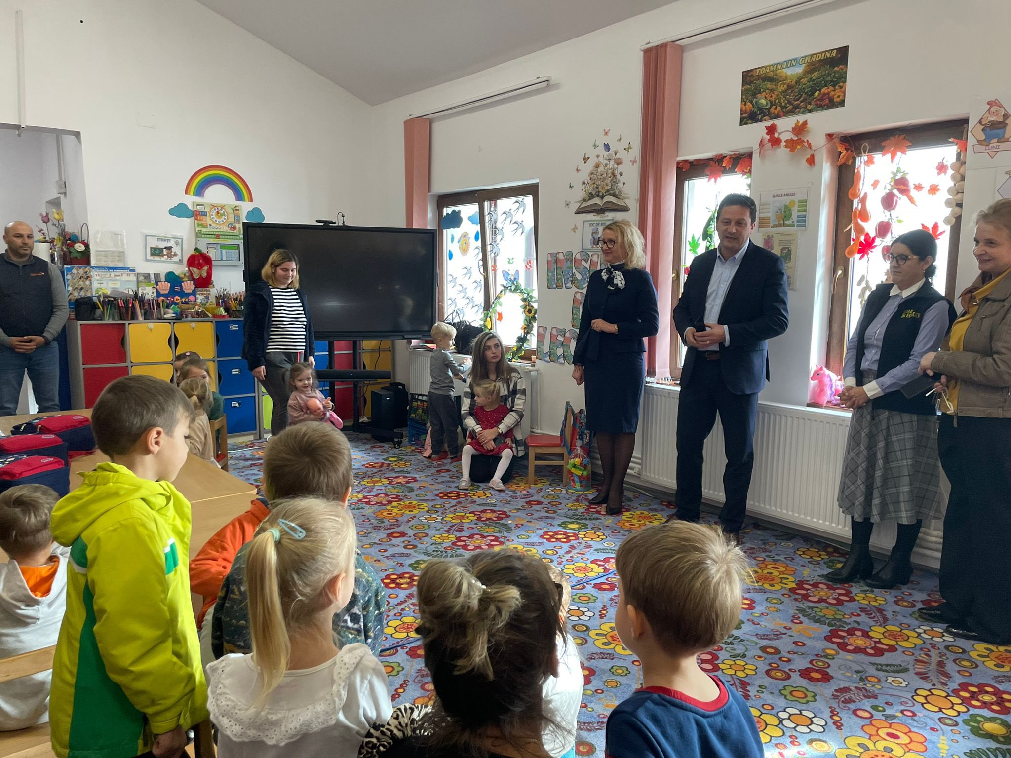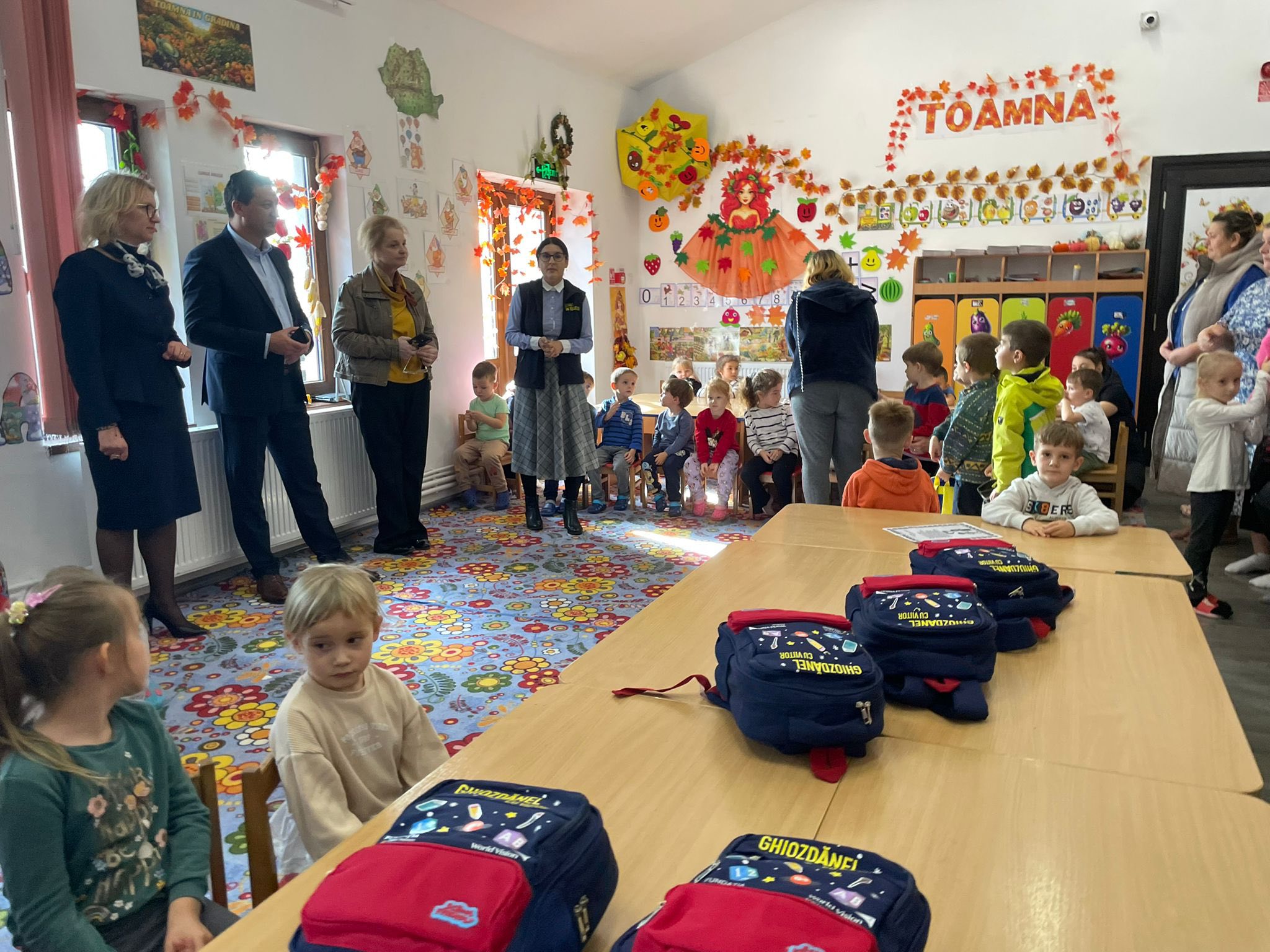 Ghiozdănelele au fost împărțite marți, 11 noiembrie 2025, fiind prezenți șeful educației botoșănene Bogdan Suruciuc și inspectorul teritorial Loredana Ciobanu.