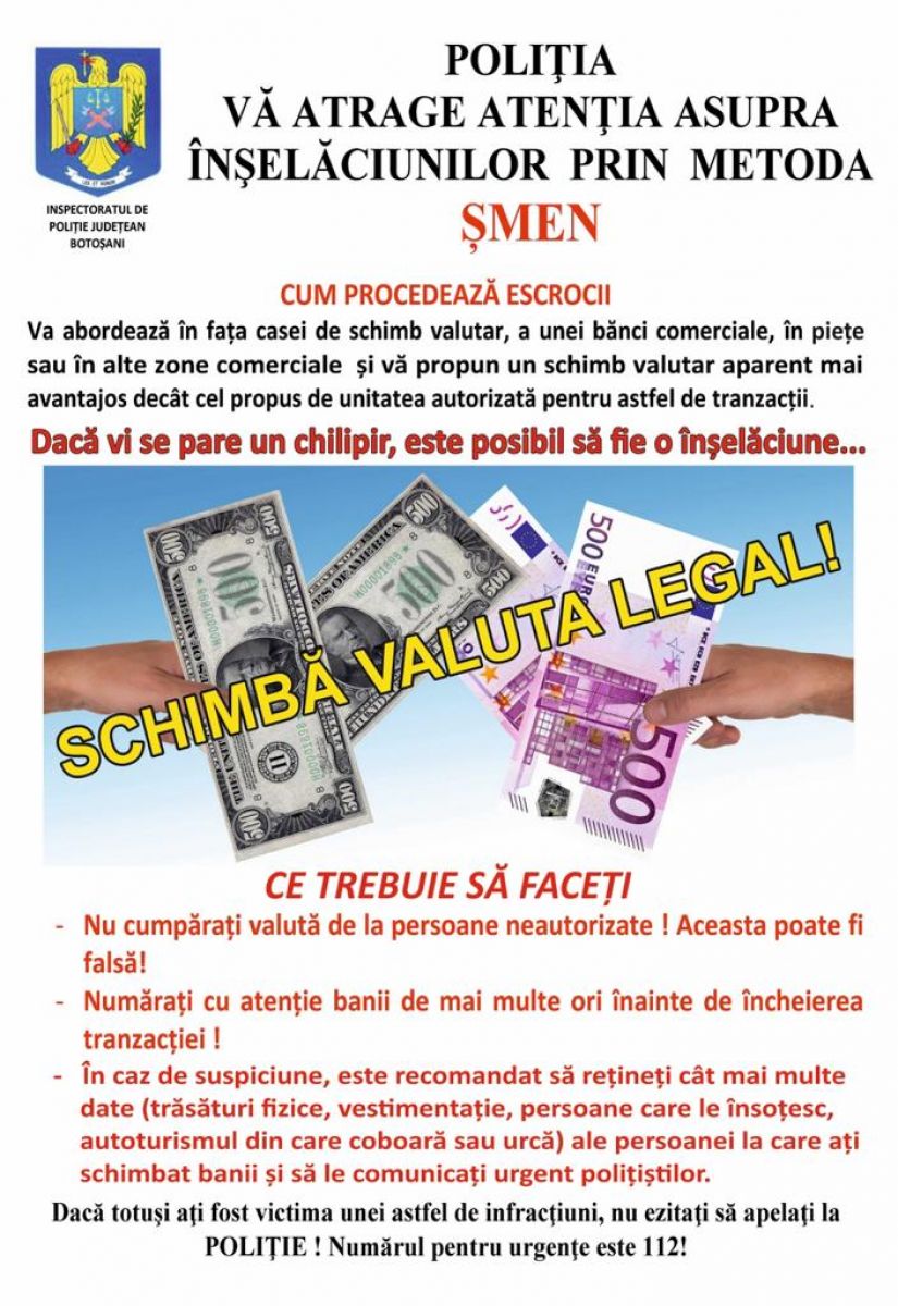 ”Vă recomandăm ca în cazul în care sunteți abordat în spațiile publice și vi se propune un schimb valutar, aparent mai avantajos decât cel propus de unitatea autorizată pentru astfel de tranzacții, nu dați curs acestor propuneri! În situația în care aveți suspiciunea că ați fost înșelat la încheierea unei tranzacții, anunțați în cel mai scurt timp poliția!”,