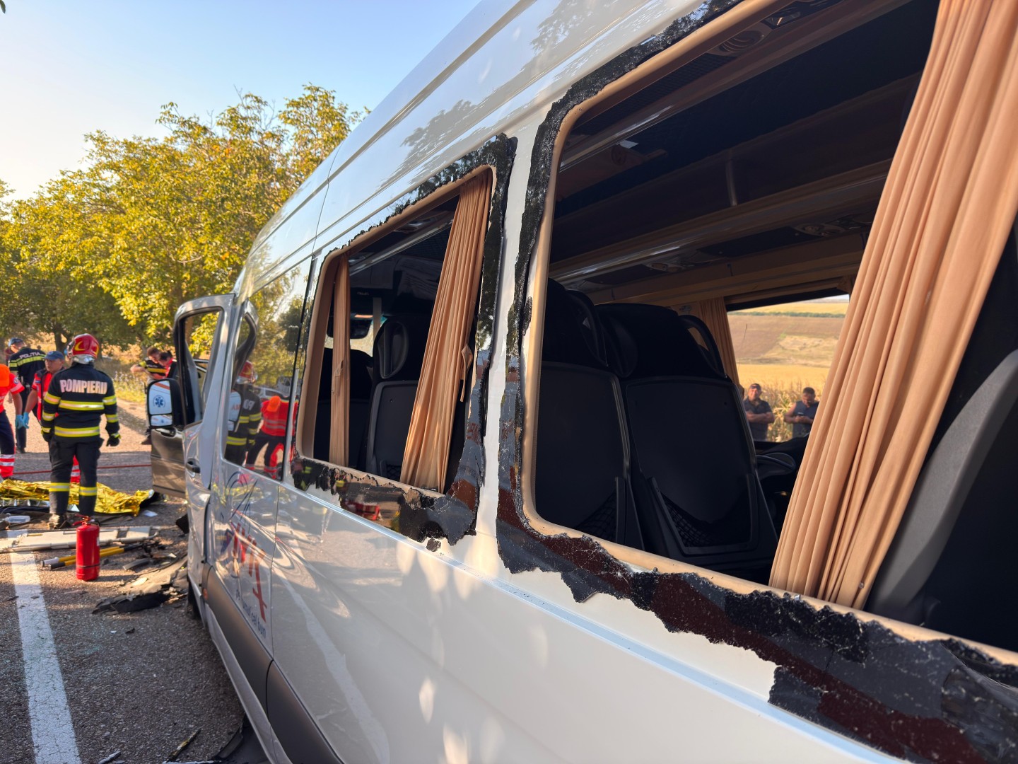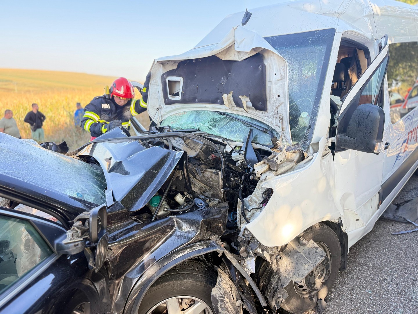 Imagini dramatice de la accident: Microbuzul și mașina s-au ciocnit frontal, răniți duși la spital
