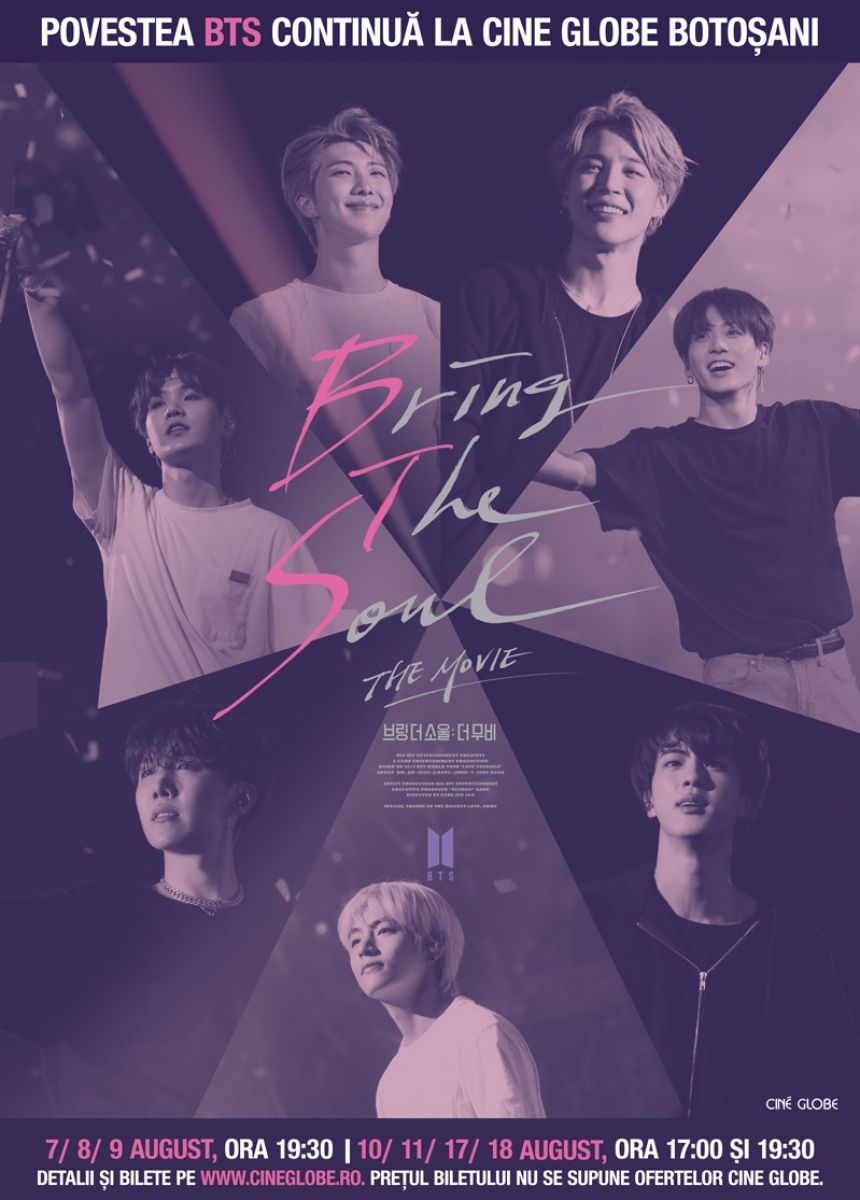 Fanii trupei coreene BTS au serioase motive de bucurie pentru că, începând cu 7 august, pot urmări pe marele ecran de la Cine Globe Botoșani imagini în exclusivitate din culise, precum și testimoniale sau imagini de la cele mai importante concerte ale trupei în filmul eveniment „Bring the Soul: The Movie”.