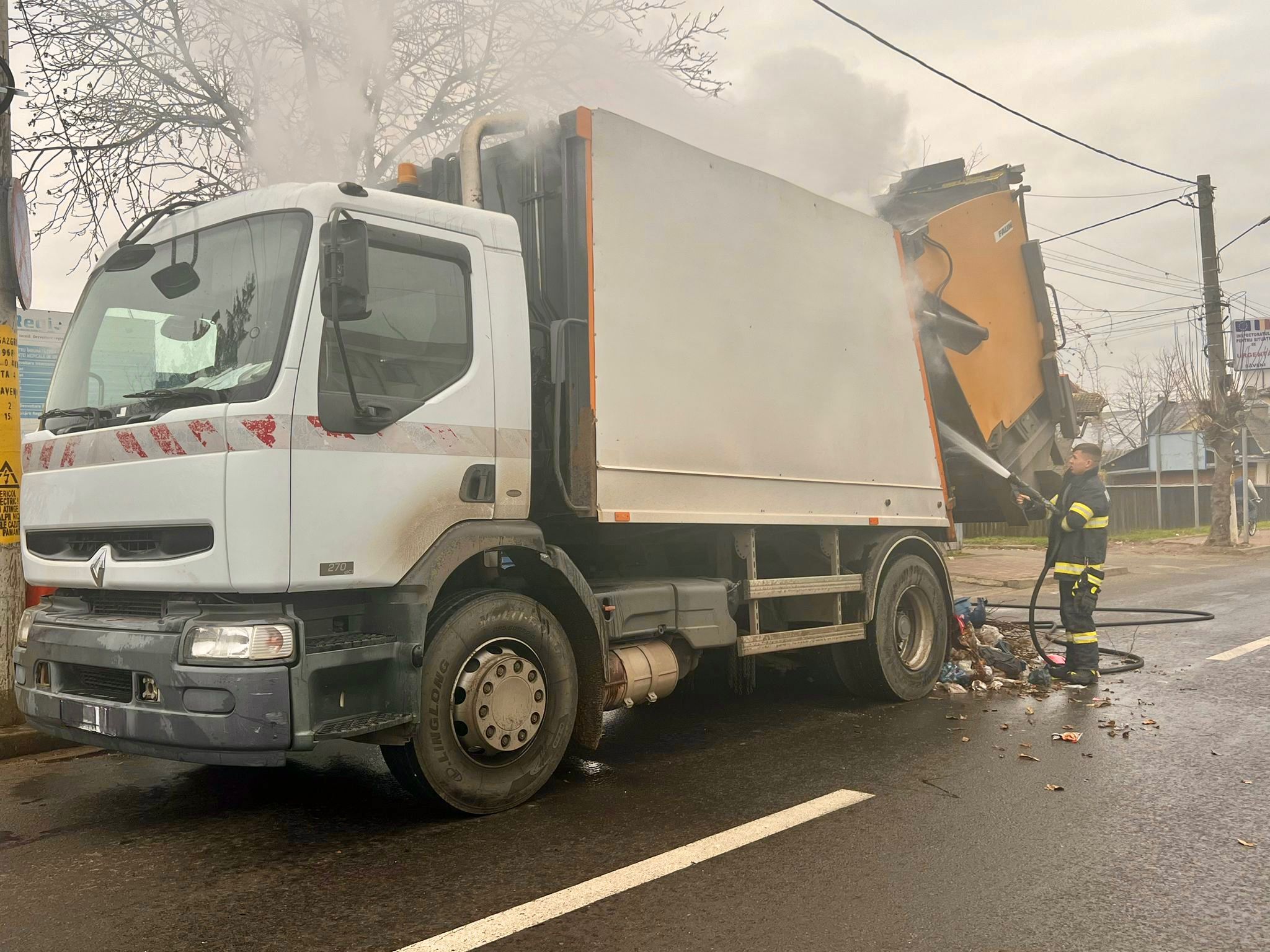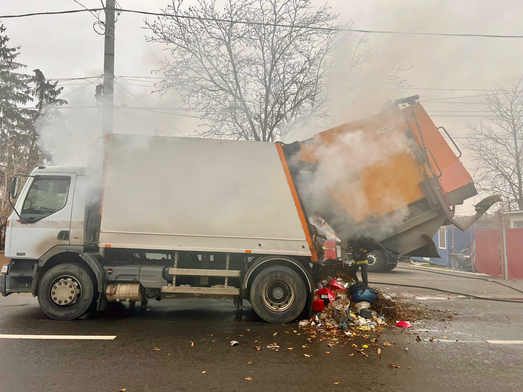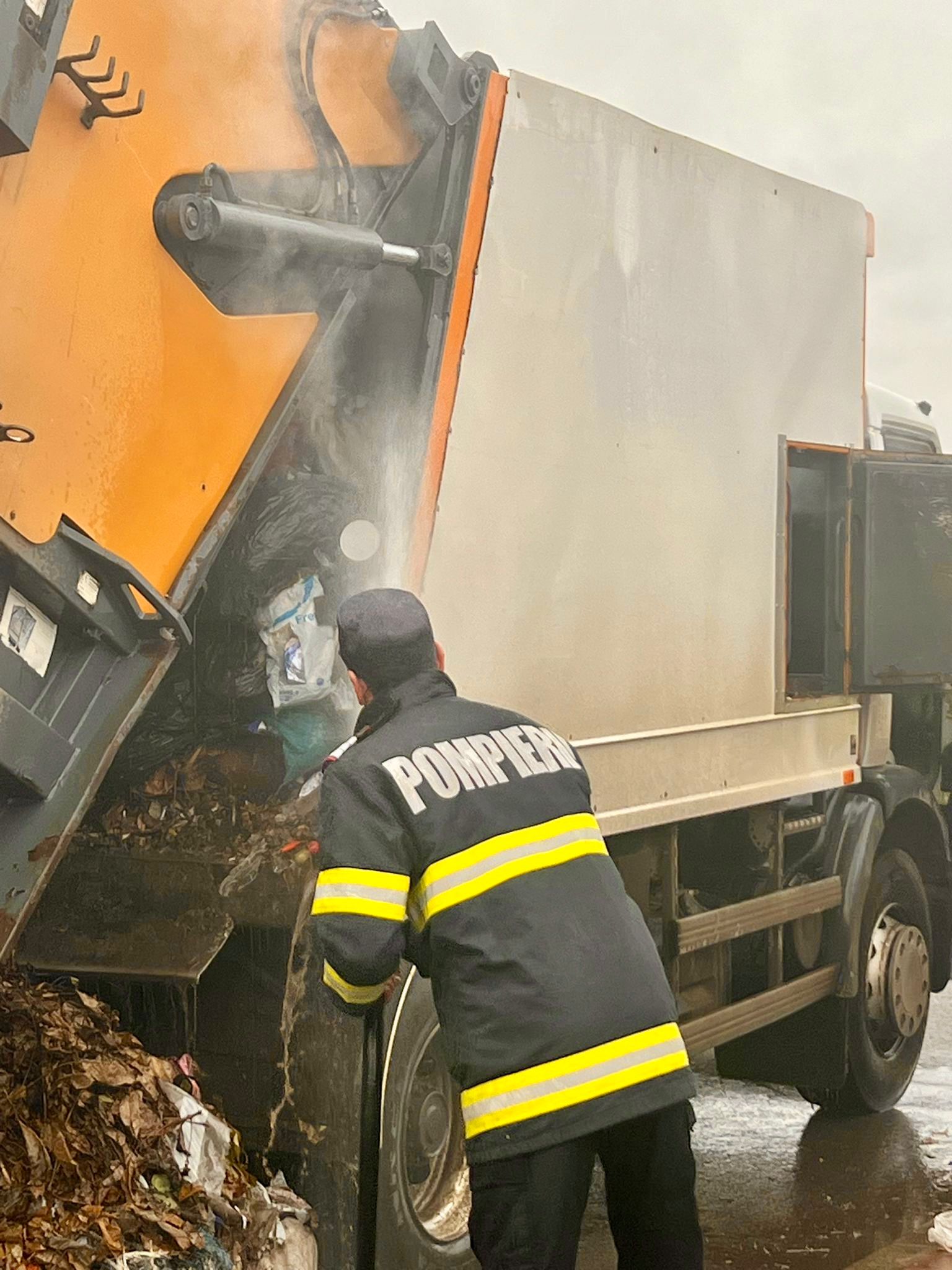 Șoferul acesteia a observat fum în bena de transport a deșeurilor și a oprit imediat în poarta Stației de Pompieri pentru a cere ajutor.