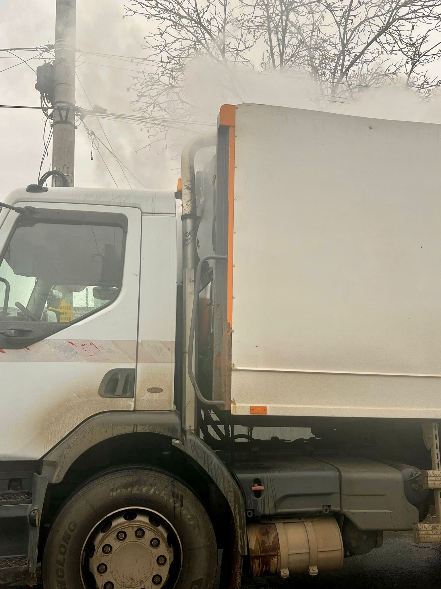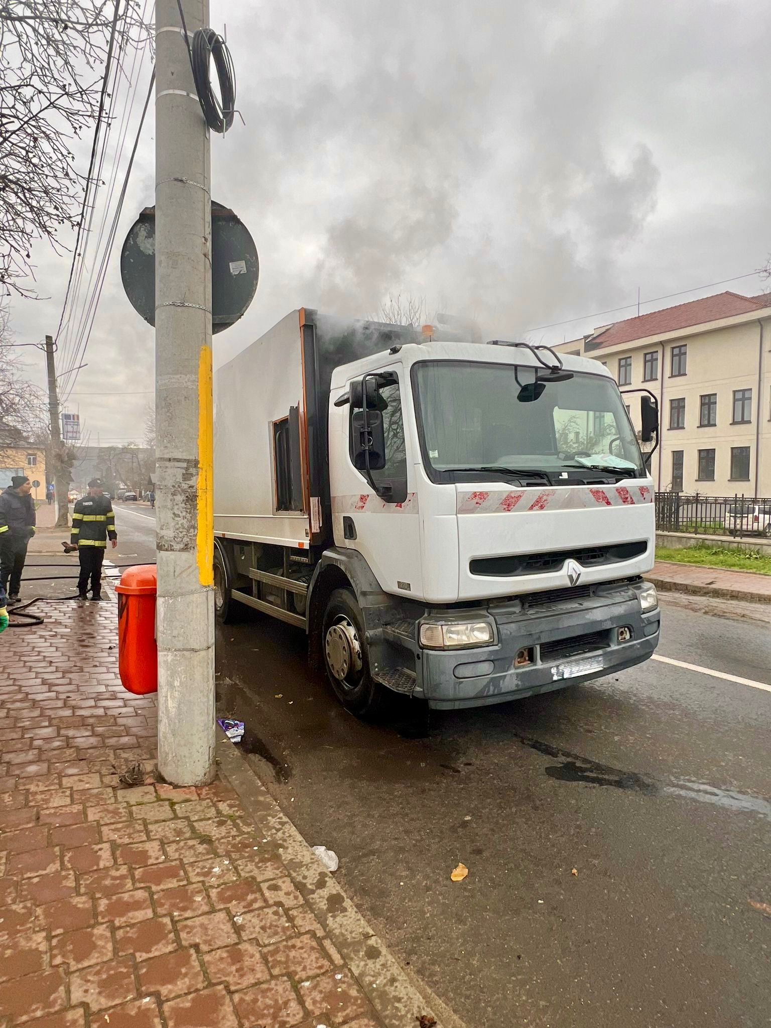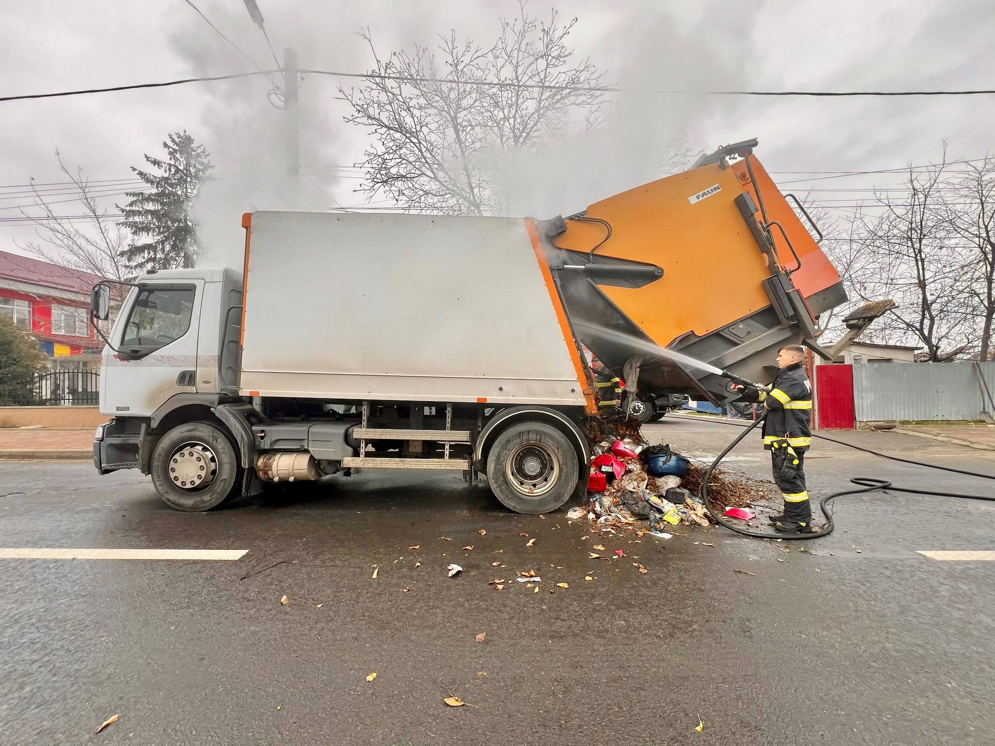 Șoferul acesteia a observat fum în bena de transport a deșeurilor și a oprit imediat în poarta Stației de Pompieri pentru a cere ajutor.
