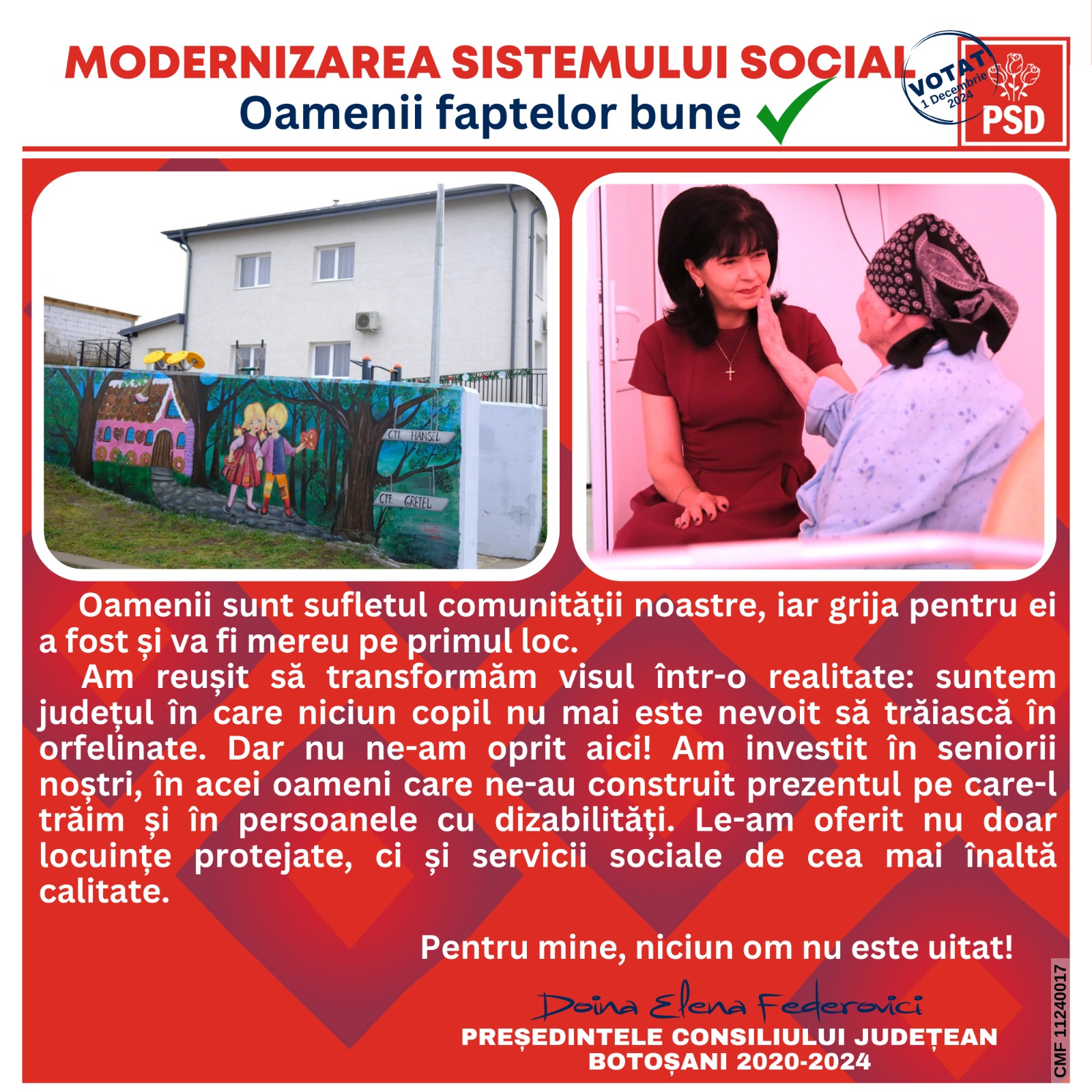 „În ultimii ani, am reușit să transformăm visul într-o realitate: suntem județul în care niciun copil nu mai este nevoit să trăiască în orfelinate. Și nu ne-am oprit aici! Am investit în seniorii noștri, în acei oameni care ne-au construit prezentul pe care-l trăim și în persoanele cu dizabilități. Le-am oferit nu doar locuințe protejate, ci și servicii sociale de cea mai înaltă calitate”, a declarat Doina Federovici, președintele PSD Botoșani.