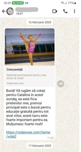 Mesajul arăta astfel: „Bună! Te rog să o votezi pe Adeline în acest sondaj. Este fiica prietenei mele, iar premiul este o bursă pentru studii în Franța. Mulțumesc mult!” urmat de un link malițios.