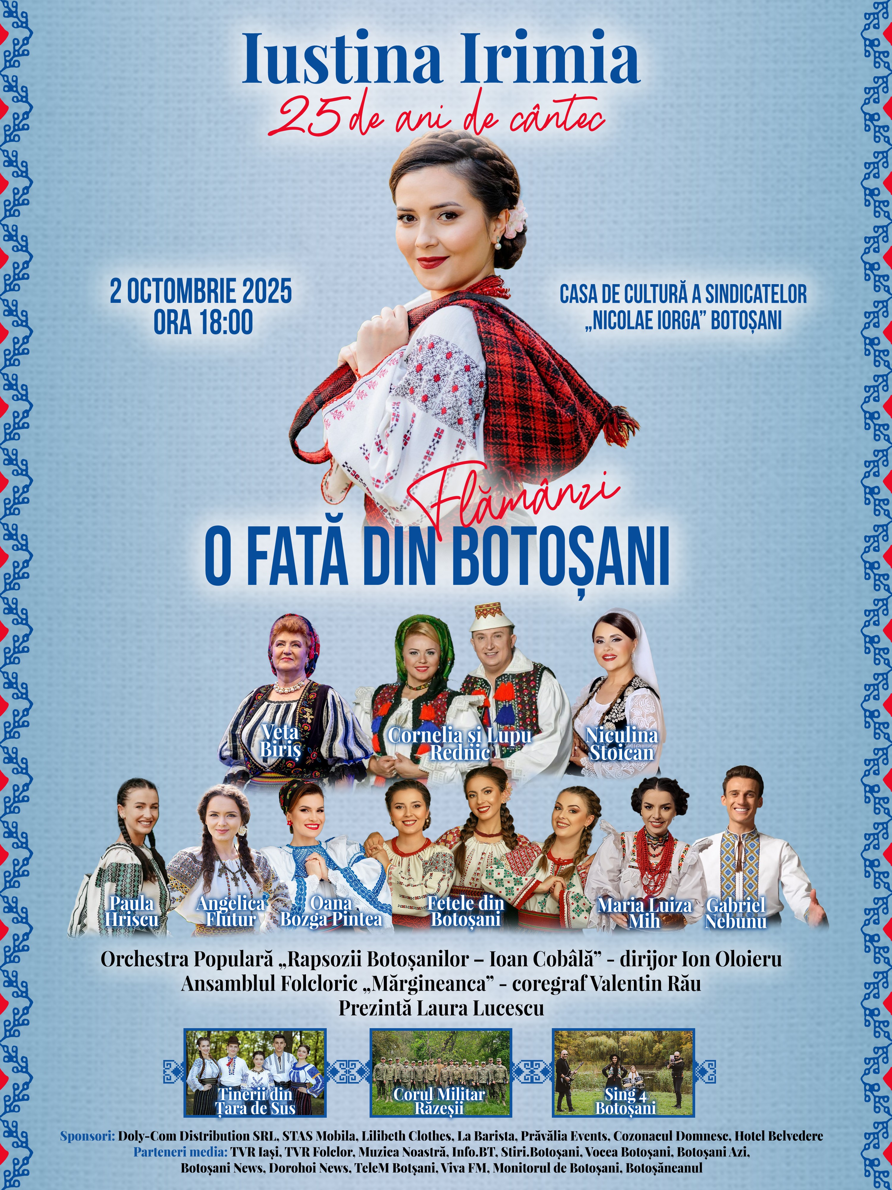 Deși face parte din tânăra generație de interpreți ai muzicii populare, Iustina Irimia, o fată din Flămânzii Botoșanilor, sărbătorește anul acesta 25 de ani de carieră, într-un spectacol de folclor organizat în data de 2 octombrie 2025, începând cu ora 18, la Casa de Cultură a Sindicatelor „Nicolae Iorga” Botoșani.