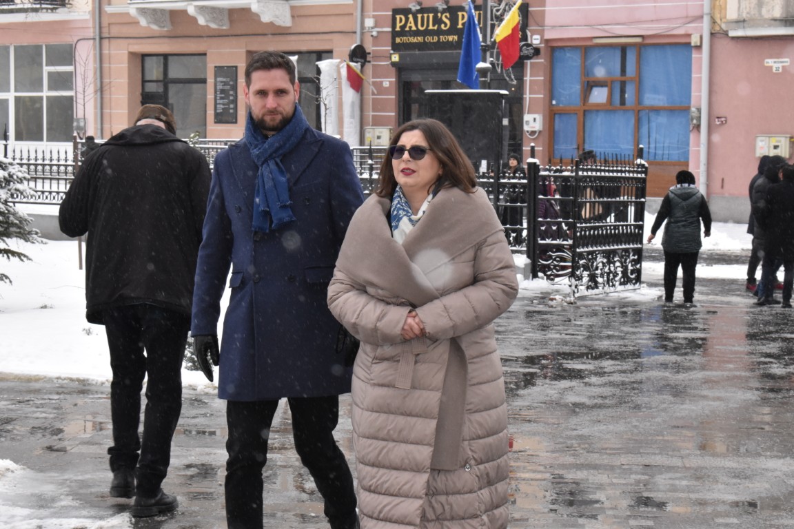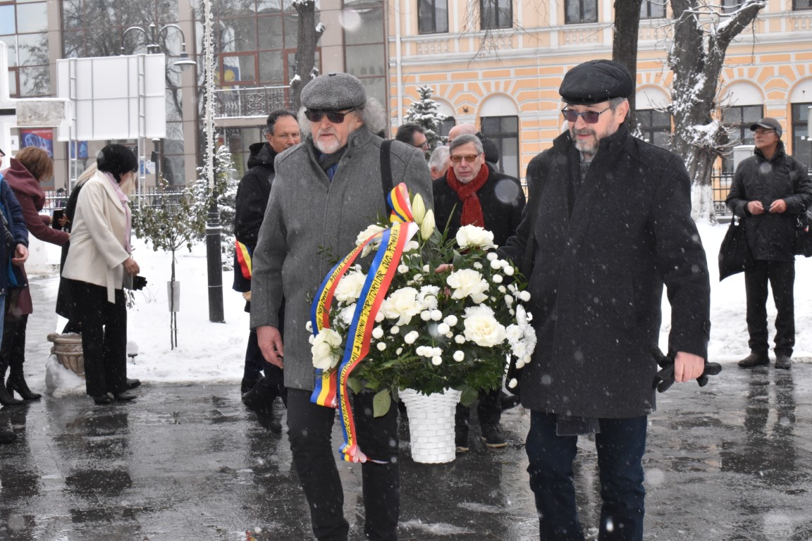 Înainte de ceremonialul religios, oficialitățile și scriitorii au depus jerbe de flori la statuia poetului nepereche din curtea bisericii.