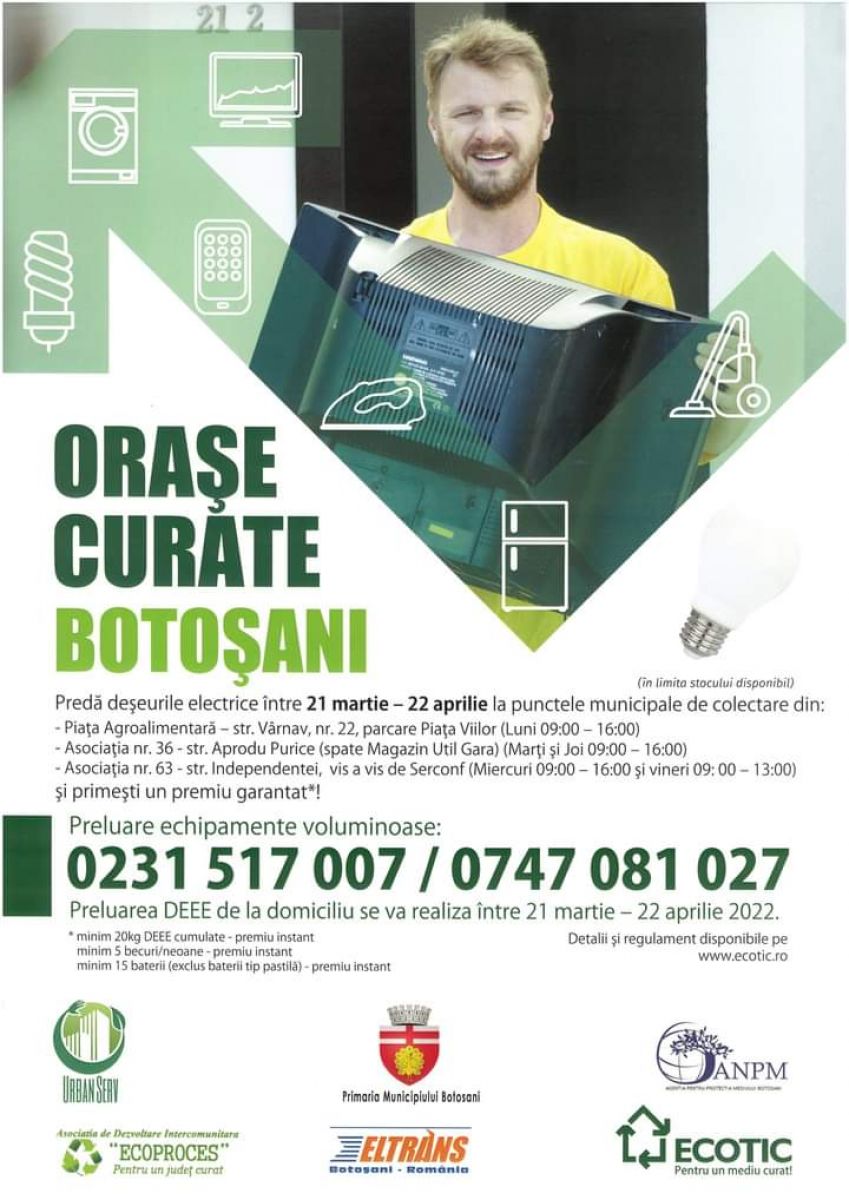 “Deșeurile de echipamente electrice conțin substanțe periculoase care odată ajunse în natură poluează pe termen lung, impactând astfel sănătatea noastră, a tuturor. Este important să înțelegem că acestea trebuie colectate separat, la puncte de colectare dedicate. Astfel, împreună cu partenerii noștri am organizat aceste campanii pentru a veni în sprijinul locuitorilor Municipiului Botoșani, orașului Bucecea și comunei Vorona , punându-le la dispoziție puncte de colectare și servicii gratuite de ridicare de la domiciliu.”