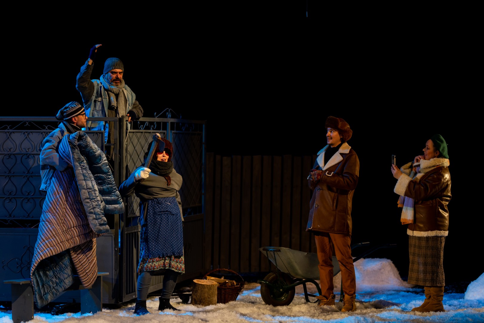 Scenografia spectacolului este semnată de Adrian Balcău, coregrafia de Victoria Bucun, iar sound-design-ul de Adrian Piciorea. Din distribuția spectacolului fac parte: Gina Patrașcu-Zamfirache, Dana Bucătaru, Crenola Muncaciu, Cezar Amitroaei, Ioan Crețescu, Răzvan Amitroaei, Gheorghe Frunză, Sorin Ciofu, Radu Dragoș și elevii Ionuț Crețu, Matei Său.
