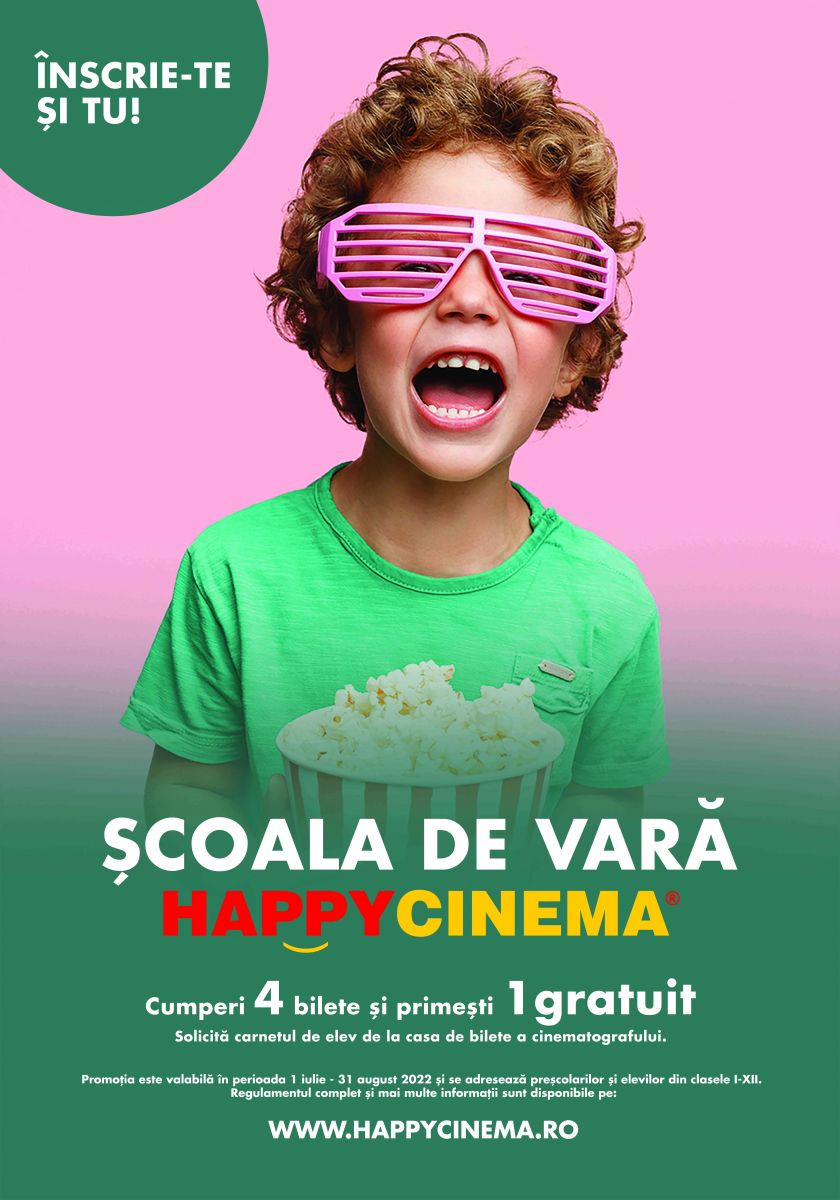 În perioada 1 iulie - 31 august, în cinematograful Happy Cinema din Botoșani se desfășoară campania “Școala de vară Happy Cinema”, care se adresează preșcolarilor și elevilor din clasele I-XII.