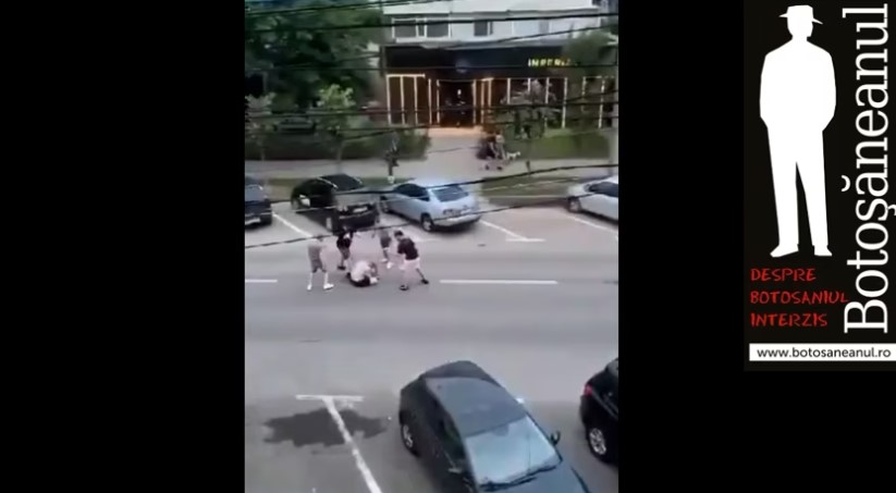 Un tânăr este căzut în mijlocul străzii iar alți patru îl lovesc cu picioarele în zona capului. Cel căzut încearcă de mai multe ori să se ridice și le cere agresorilor să înceteze să-l lovească.