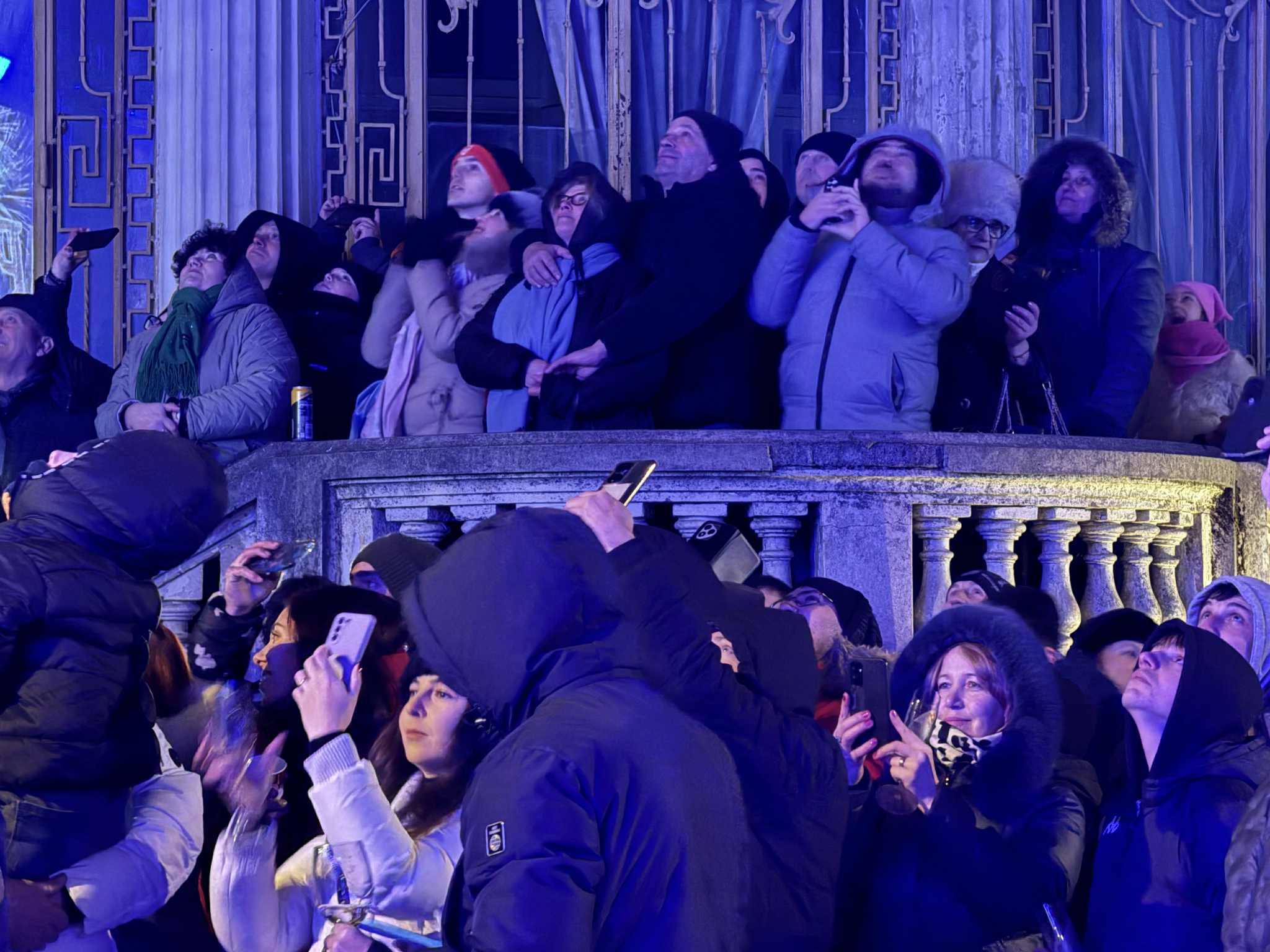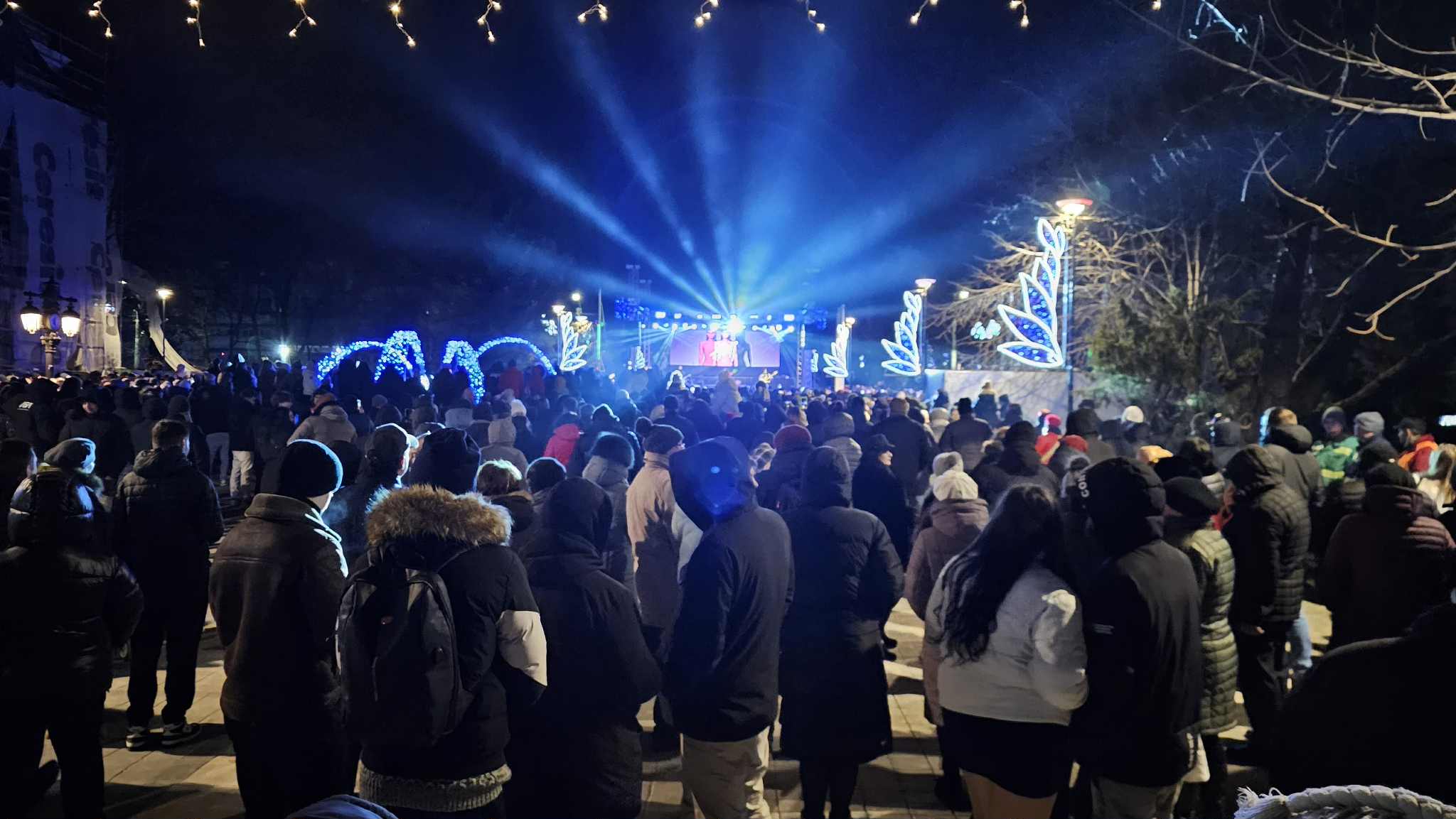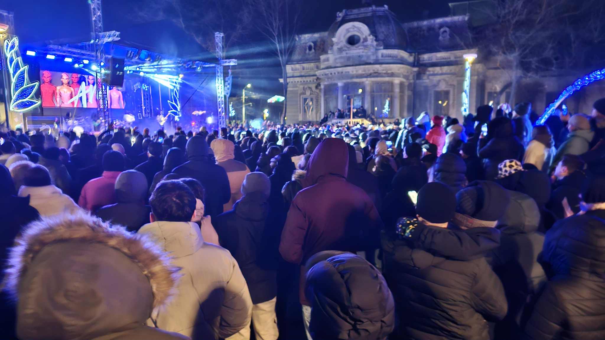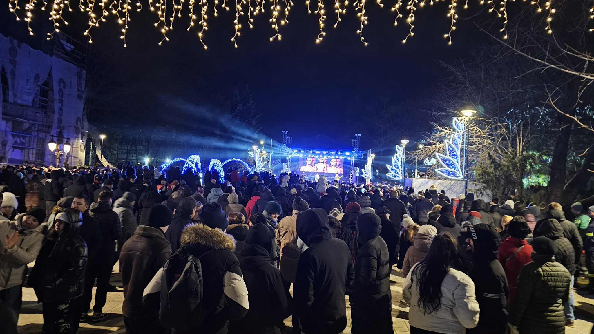 Câteva mii de botoșăneni au intrat în 2026 pe Pietonalul Unirii, peste drum de Monumentul Răscoalei de la 1907, acolo unde Primăria a mutat revelionul de stradă în acest an.
