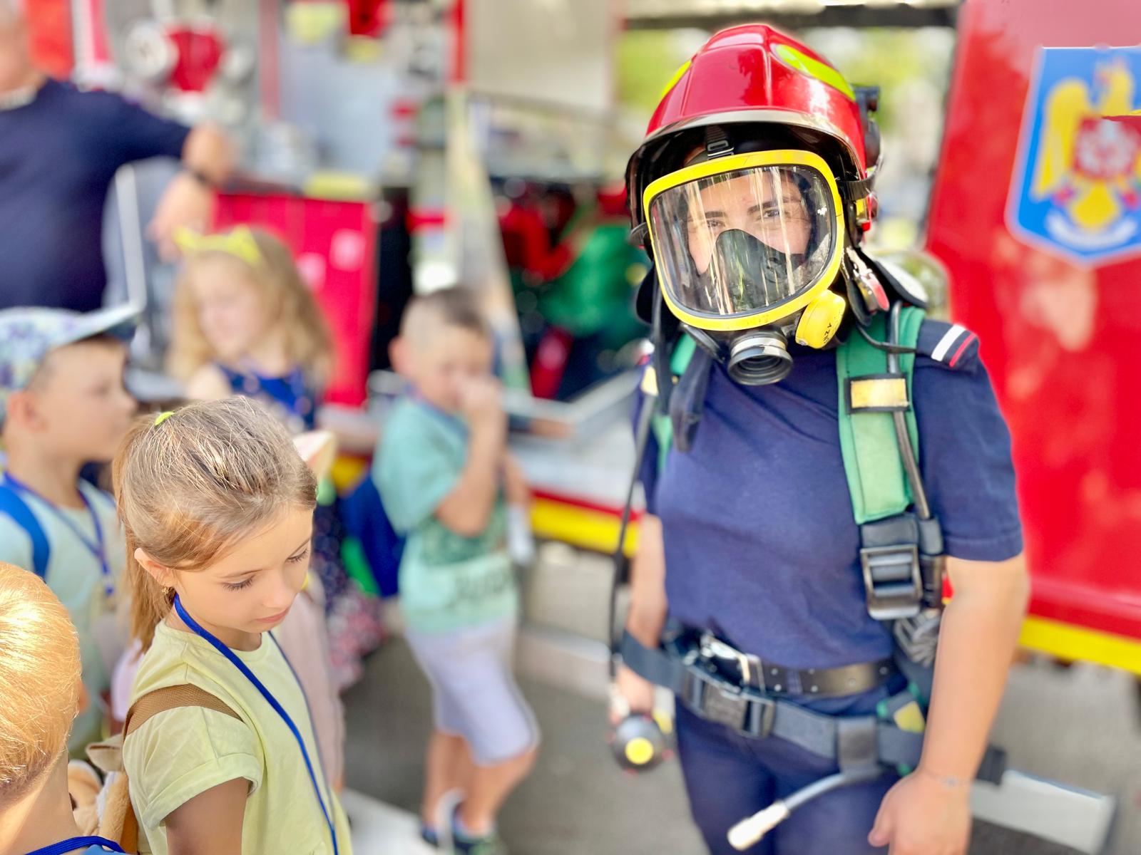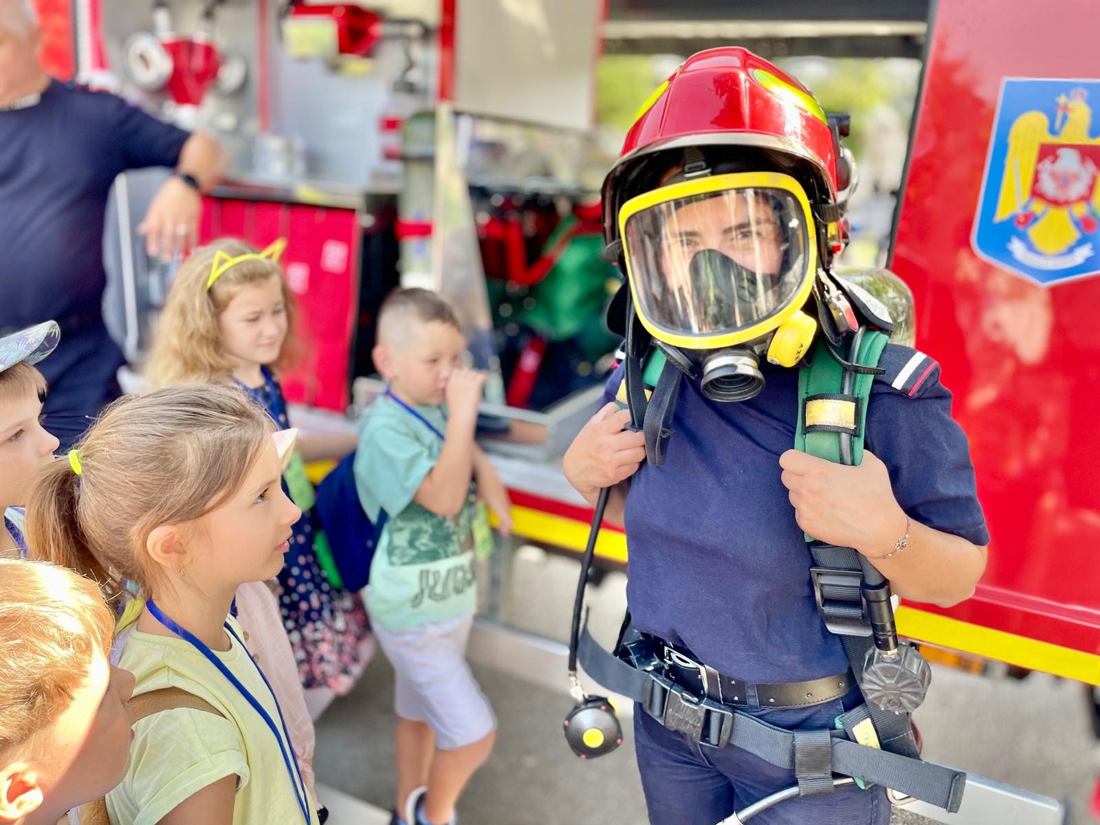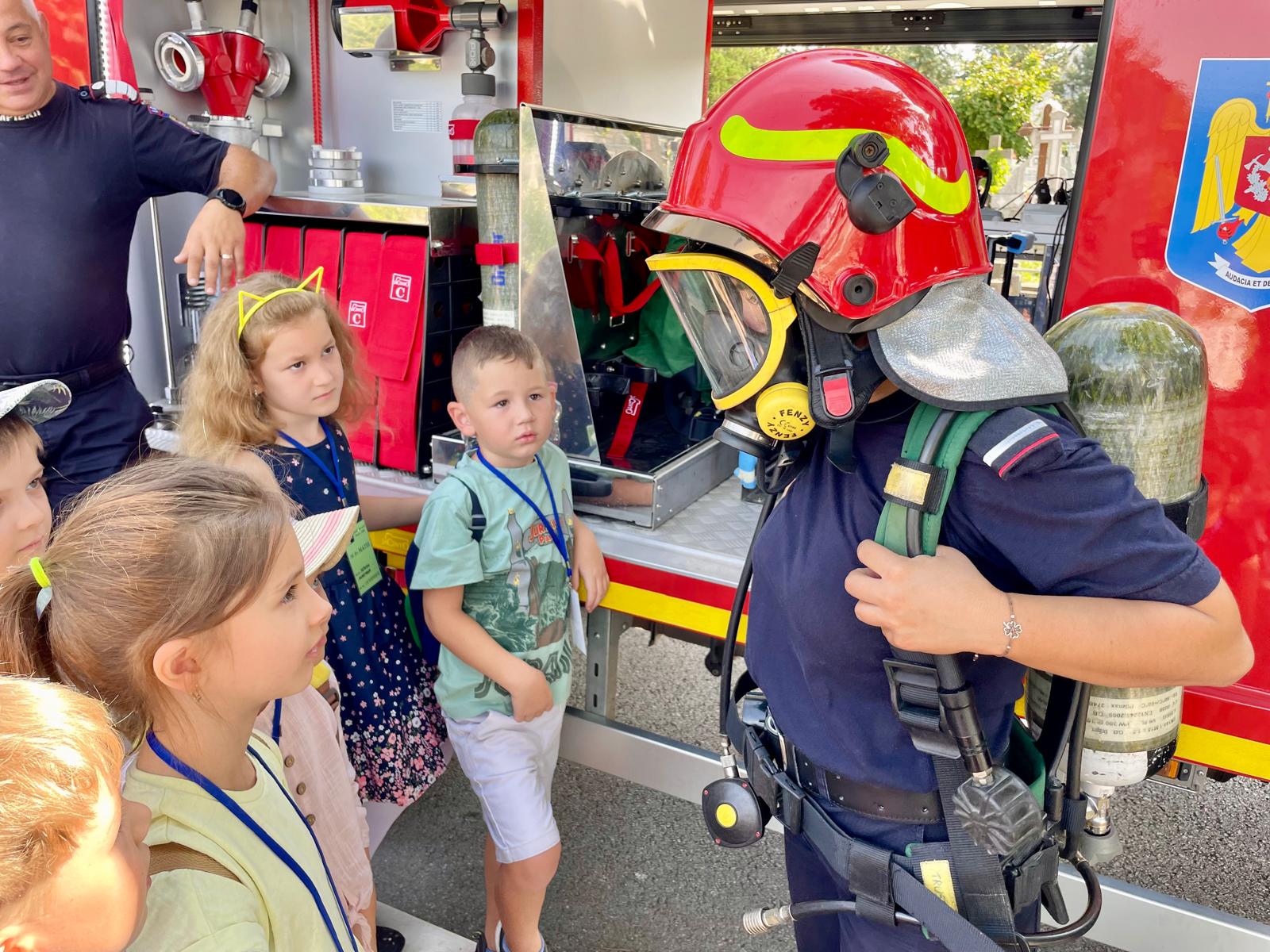 Au avut ocazia să studieze, îndeaproape, autospecialele de stingere și pirotehnică și să probeze echipamentele de protecție folosite de pompieri în misiunile operative.