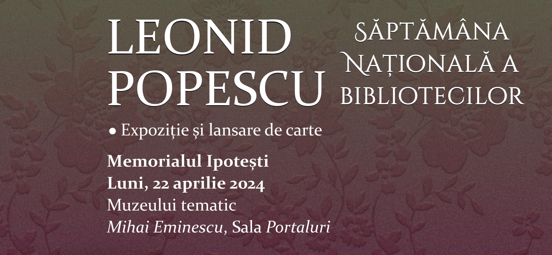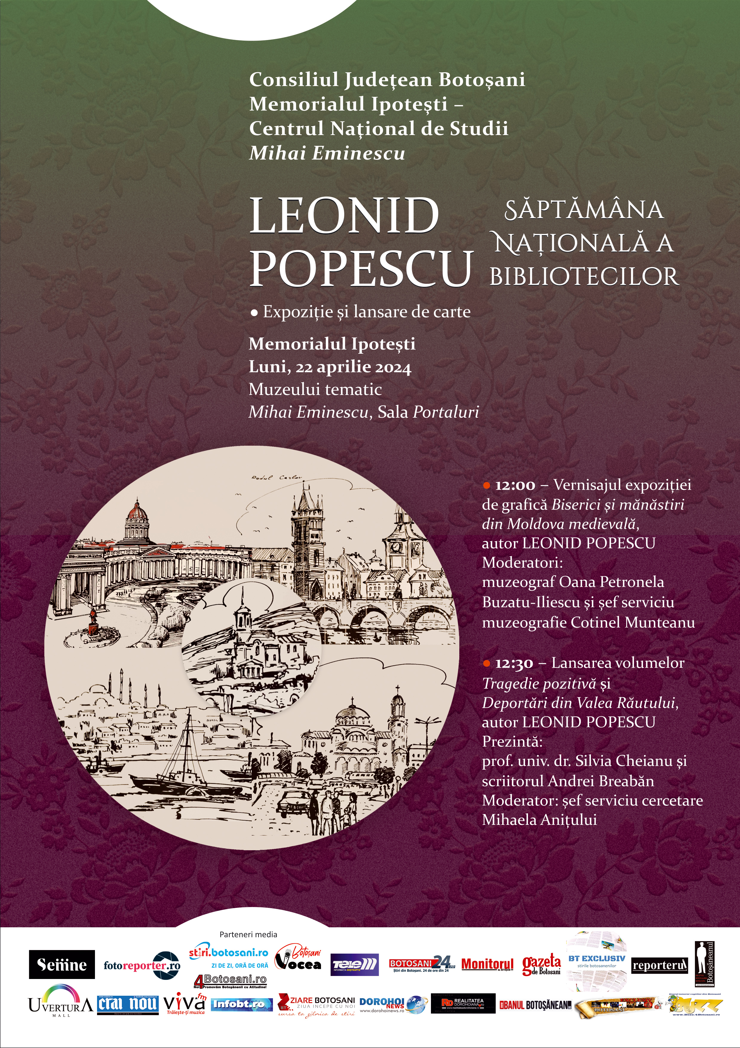 Memorialul Ipotești – Centrul Național de Studii Mihai Eminescu, instituție din subordinea Consiliului Județean Botoșani, vă invită luni, 22 aprilie 2024, ora 12:00, la vernisajul expoziției de grafică Biserici şi mănăstiri din Moldova medievală, autor – Leonid Popescu, pictor, scriitor, maestru al artei, Artist al Poporului din Republica Moldova. Evenimentul va fi moderat de muzeograful Oana Petronela Buzatu-Iliescu și Cotinel Munteanu, șef serviciu muzeografie, Memorialul Ipotești.