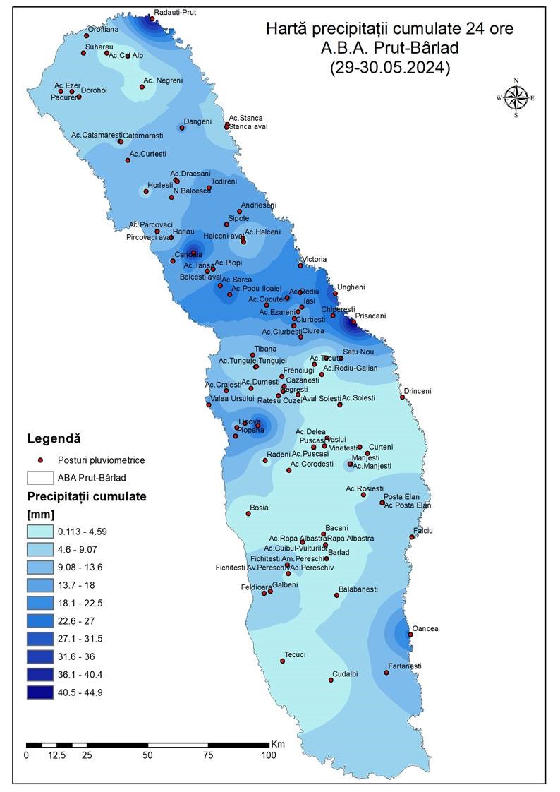 Precipitațiile maxime cumulate în ultimele 24 de ore în spațiul hidrografic (sh) Prut-Bârlad sunt următoarele:
