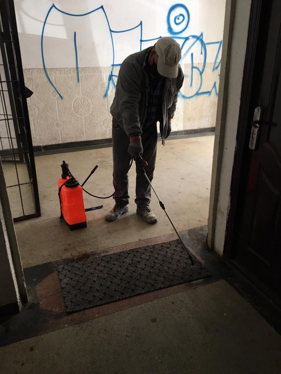În plus, s-au montat dispensere pentru dezinfecția mâinilor la intrările în scările de bloc și s-au pus preșuri care au fost îmbibate cu soluție dezinfectantă.