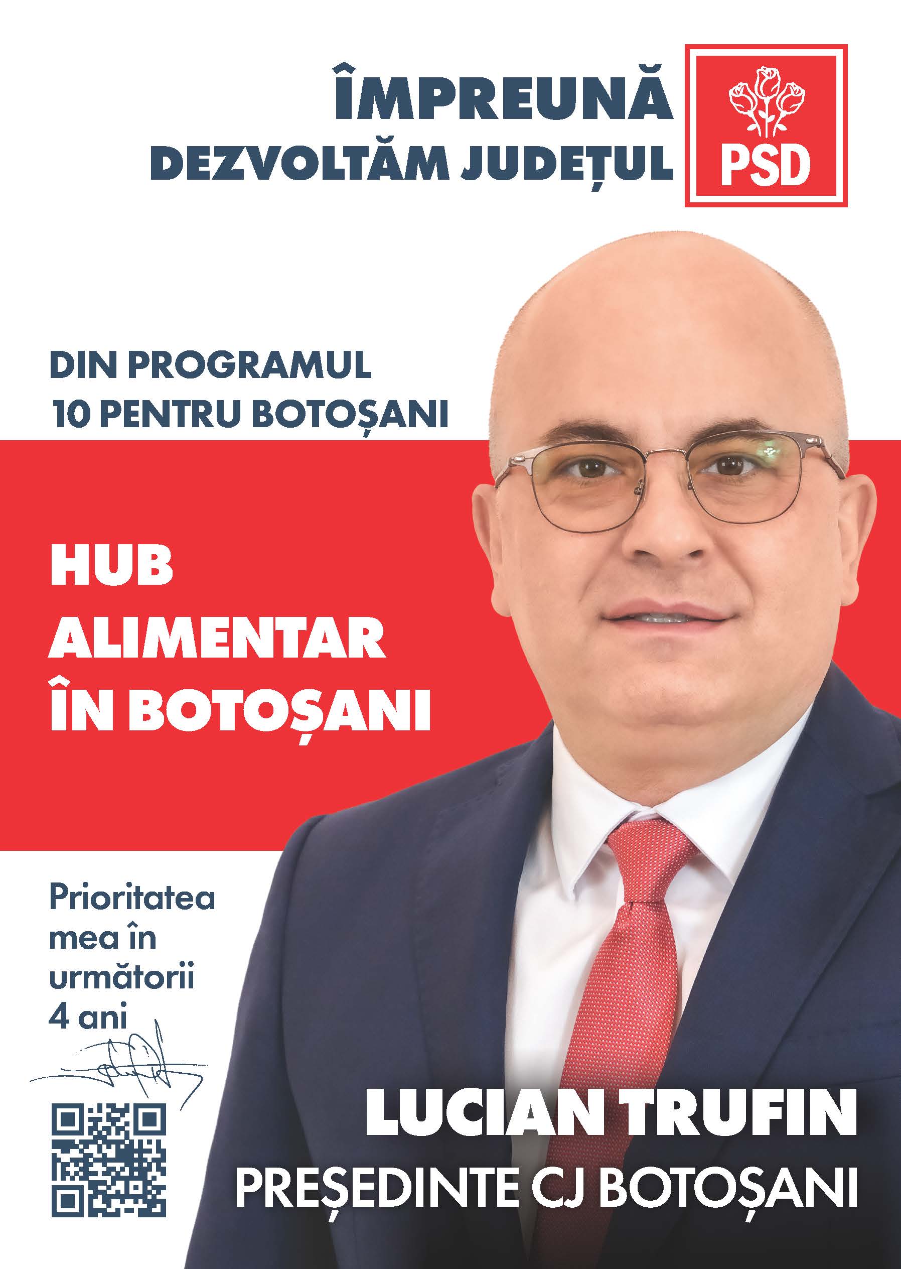 Candidatul PSD pentru funcția de președinte al Consiliului Județean Botoșani, Lucian Trufin, spune că proiectul său de a realiza un hub alimentar în Botoșani va sprijini producția agroalimentară locală și va aduce hrană sănătoasă și gustoasă pentru cetățeni.