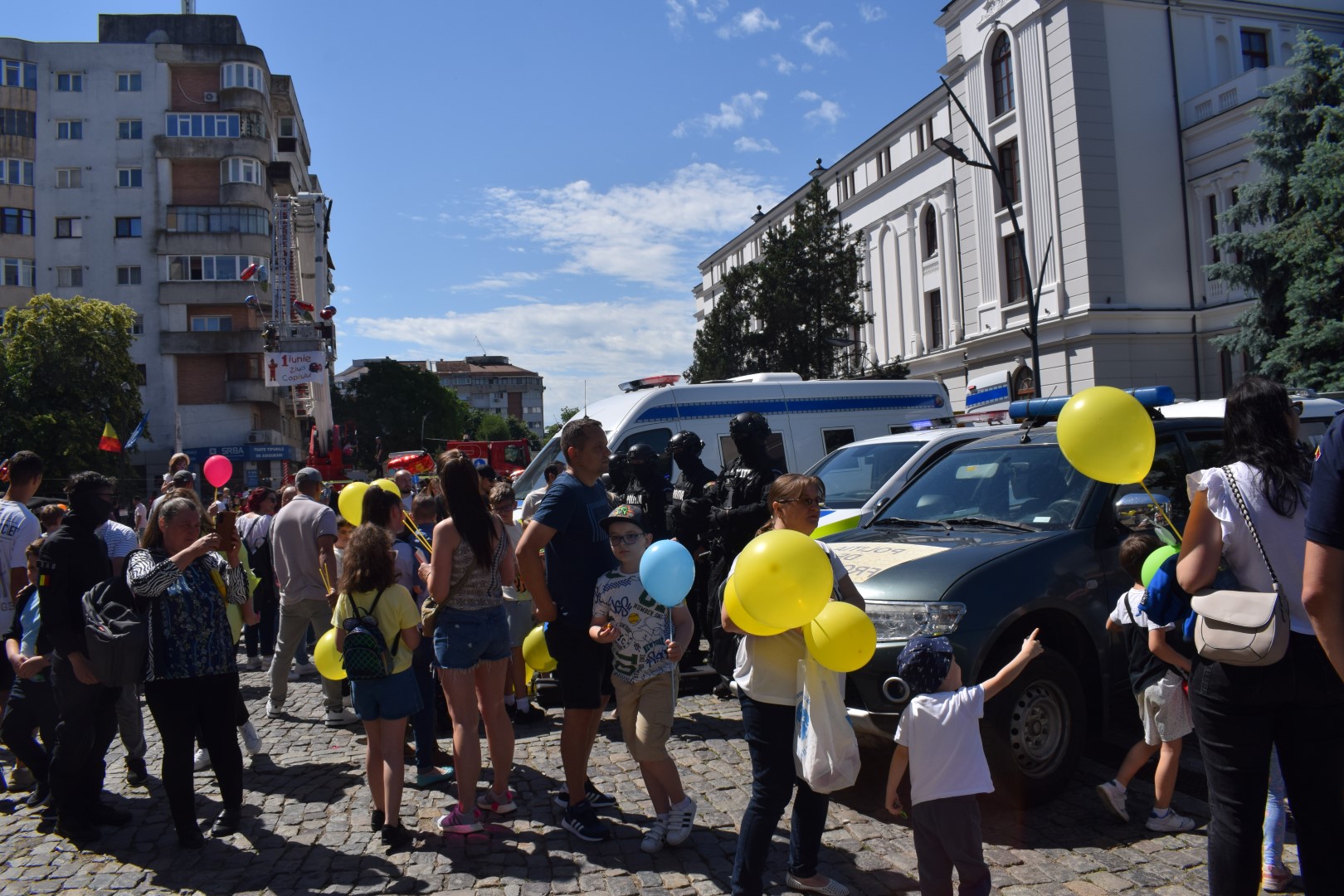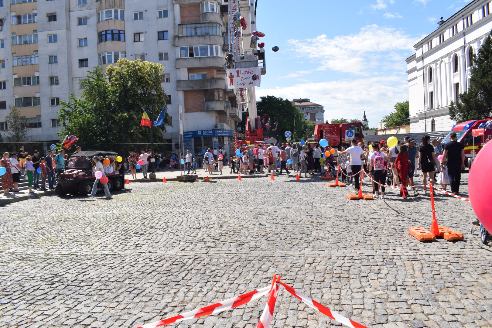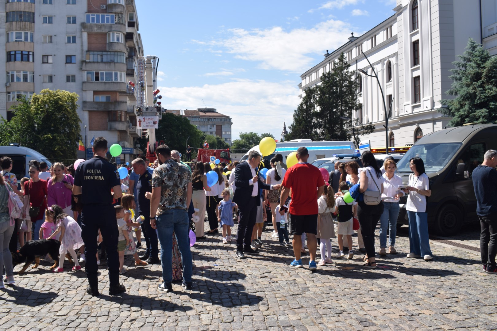 Special pentru evenimentul dedicat copiilor au fost aduse în Piața Revoluției tot felul de echipaje și tehnică specifică instituțiilor MAI. Prefectul Sorin Cornilă a împărțit sute de baloane copiilor prezenți.