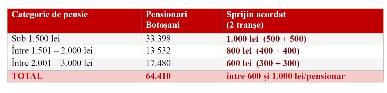 Județul Botoșani are o comunitate numeroasă de oameni care au muncit o viață întreagă și care merită susținere. Tocmai de aceea, această măsură are o însemnătate aparte pentru concetățenii noștri. Astfel, 64.410 de pensionari din județ cu venituri sub 3.000 lei beneficiază de un sprijin financiar direct, acordat în două tranșe egale.