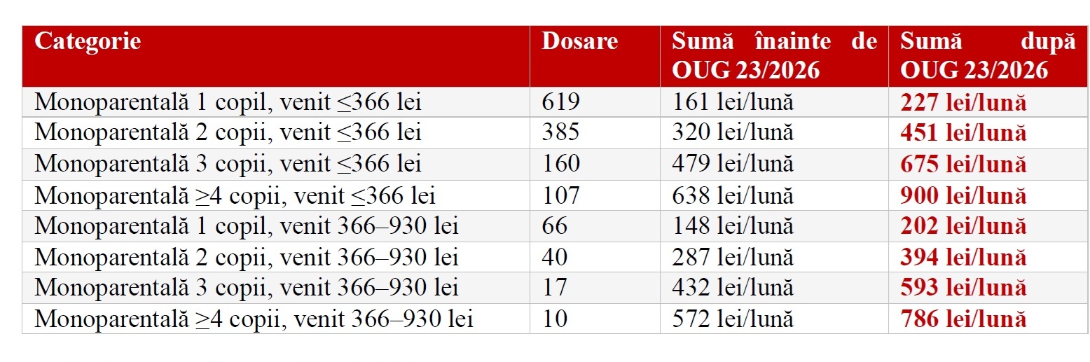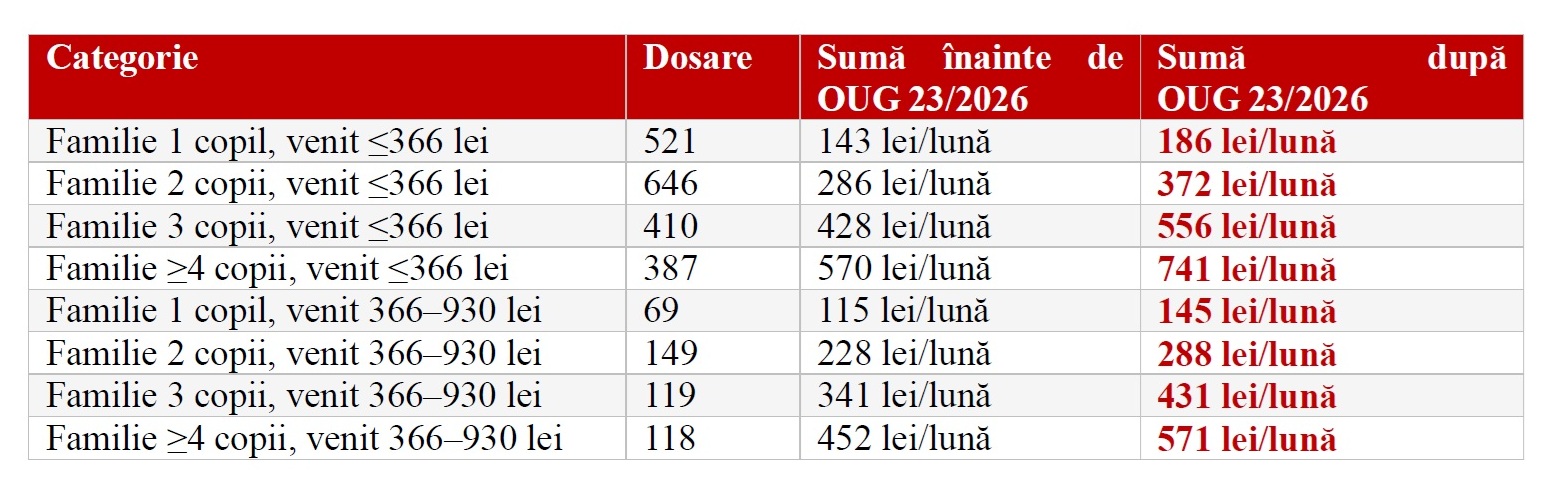 De asemenea, 3.823 de familii cu copii din județ beneficiază de ajutor majorat în cadrul venitului minim de incluziune. Suma lunară totală alocată crește cu aproximativ 33%, de la 1.193.228 lei la 1.589.010 lei.