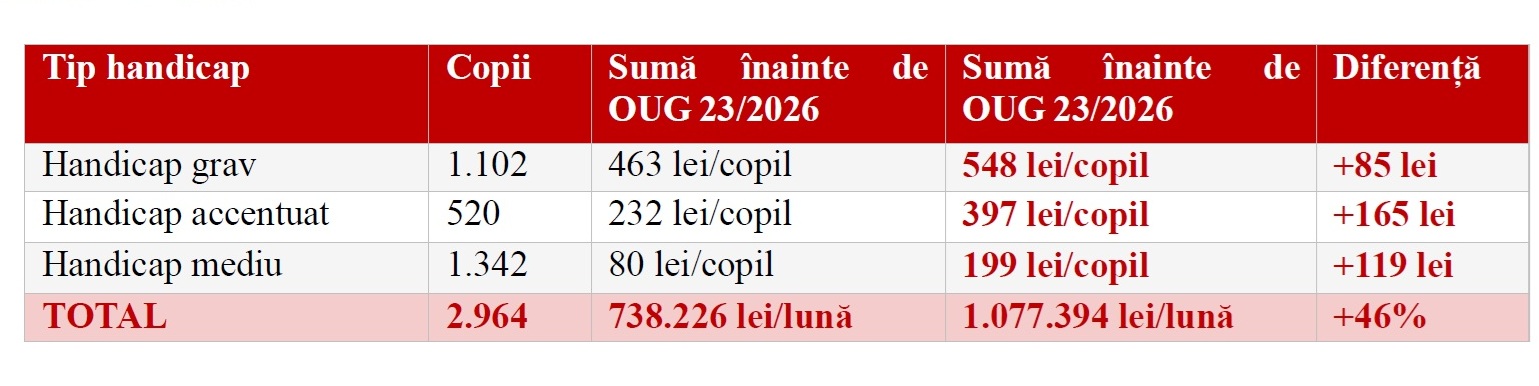 Prin Programul Social promovat de PSD, 2.964 de copii cu dizabilități din județ beneficiază de majorarea bugetului personal complementar lunar. Suma totală lunară crește cu 46%,de la 738.226 lei la 1.077.394 lei.