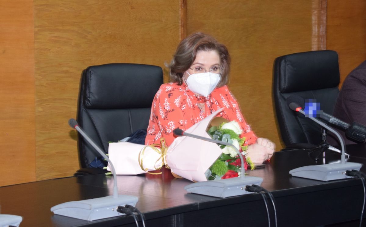 Prefectul Dan Nechifor i-a oferit un buchet de flori la conferința organizată în sala Nicolae Iorga a Palatului Administrativ.