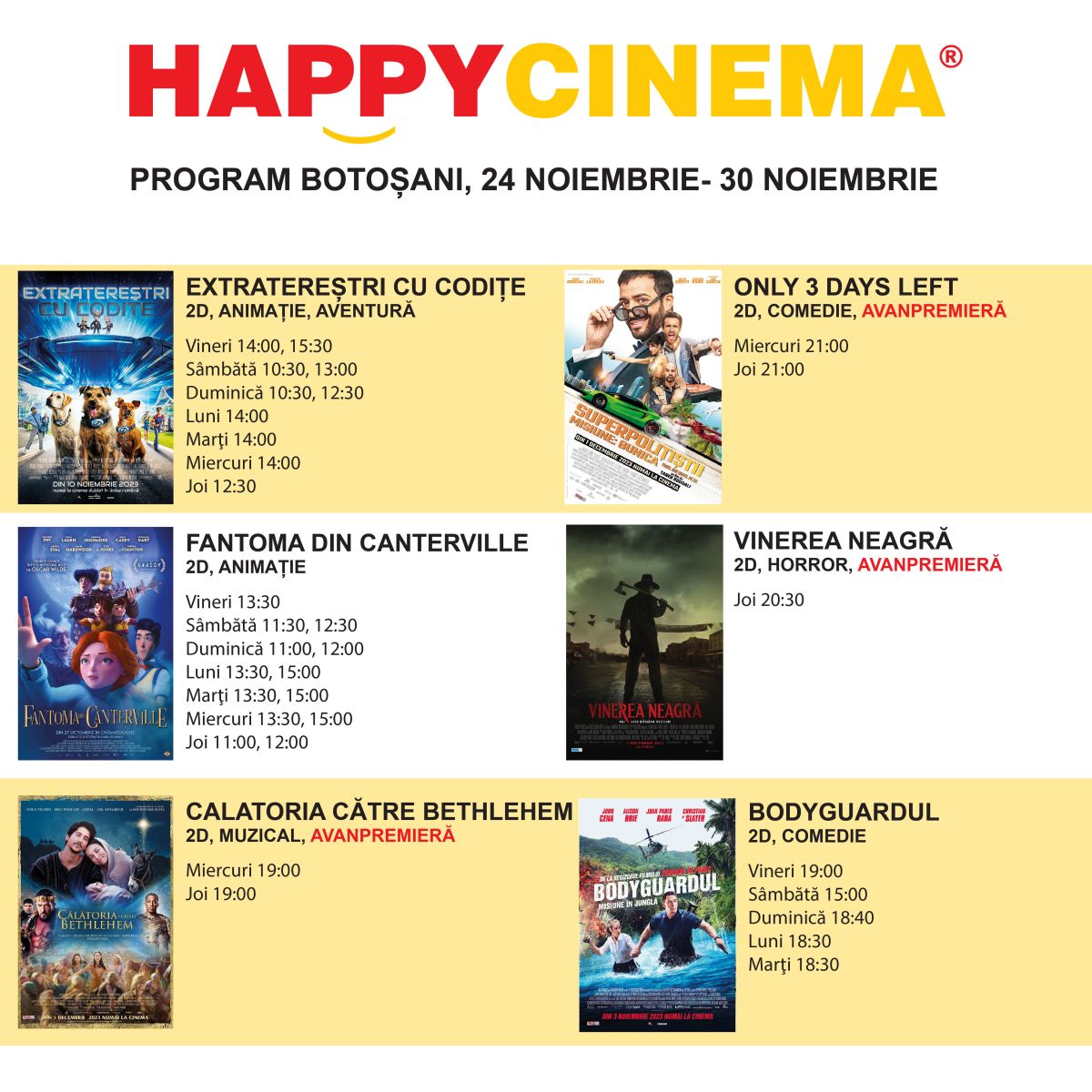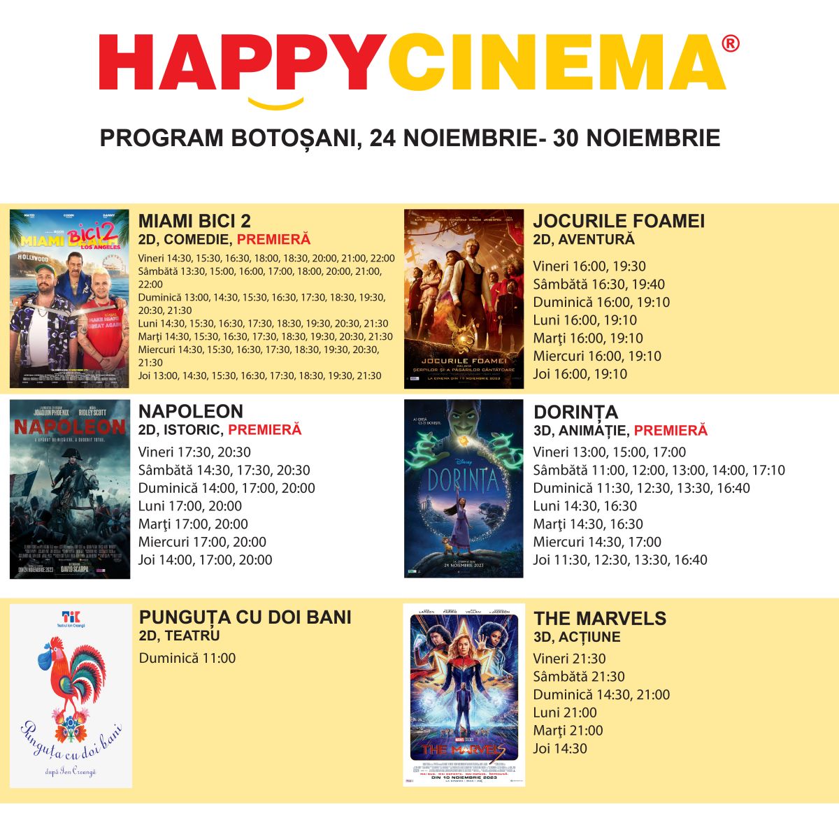 Happy Cinema Botoșani a transmis programul pentru săptămâna 24 – 30 noiembrie 2023.