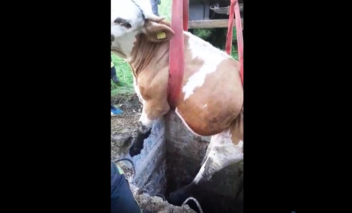 Au legat bovina cu mai multe furtunuri și cu ajutorul unui buldoexcavator au reușit să o aducă la suprafață fără să o rănească.