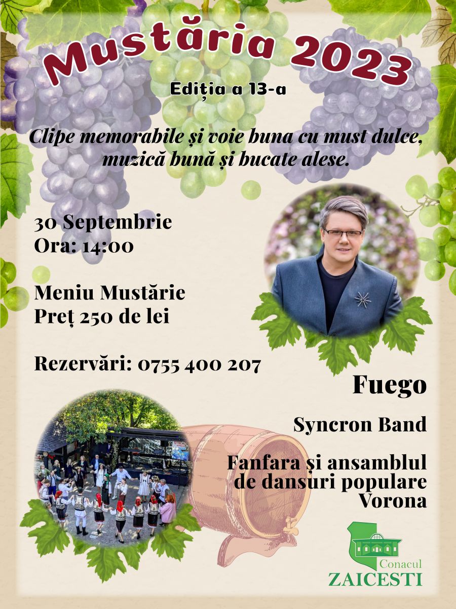 Sâmbătă, 30 septembrie 2023, începând cu ora 14:00, botoșănenii se pot bucura de roadele toamnei, de preparate alese și pot petrece într-o atmosferă de sărbătoare alături de marele artist Fuego, Syncron Band, Fanfara și Ansamblul de dansuri populare de la Vorona, în cadrul evenimentului Mustăria la Conac.