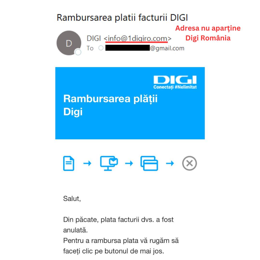 Utilizatorii vizați de atac primesc un e-mail care pare a proveni din partea companiei Digi România, sub pretextul anulării plății unei facturi efectuate de către utilizator. În același e-mail, se prezintă oportunitatea utilizatorului de a primi un ramburs al plății efectuate, dacă acesta dă click pe un link din email. Email-ul, însă, provine de la o adresă falsă.