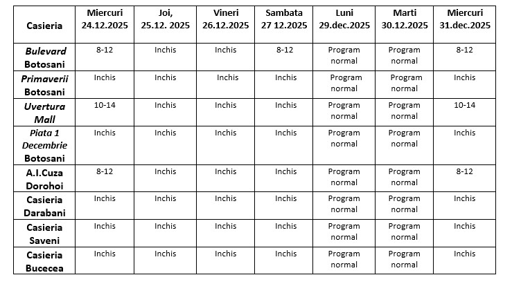 Nova Apaserv Botoșani a făcut public programul casieriilor pentru perioada 24 decembrie 2025 – 8 ianuarie 2026, interval în care vor exista mai multe zile nelucrătoare, atât din cauza sărbătorilor, cât și a inventarului anual.